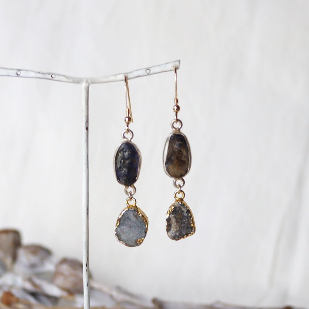 原石アイオライトとドゥルージークォーツのピアス