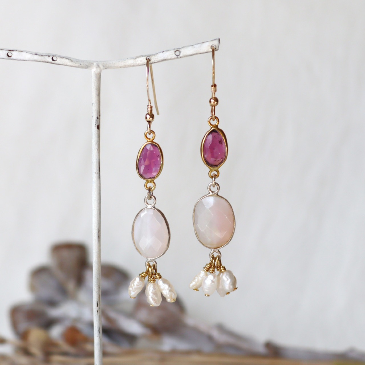 こっくりとしたワイン色のロードライトガーネット、ピンクの縞模様が入ったアゲート、ナチュラルな形のスティックパール。