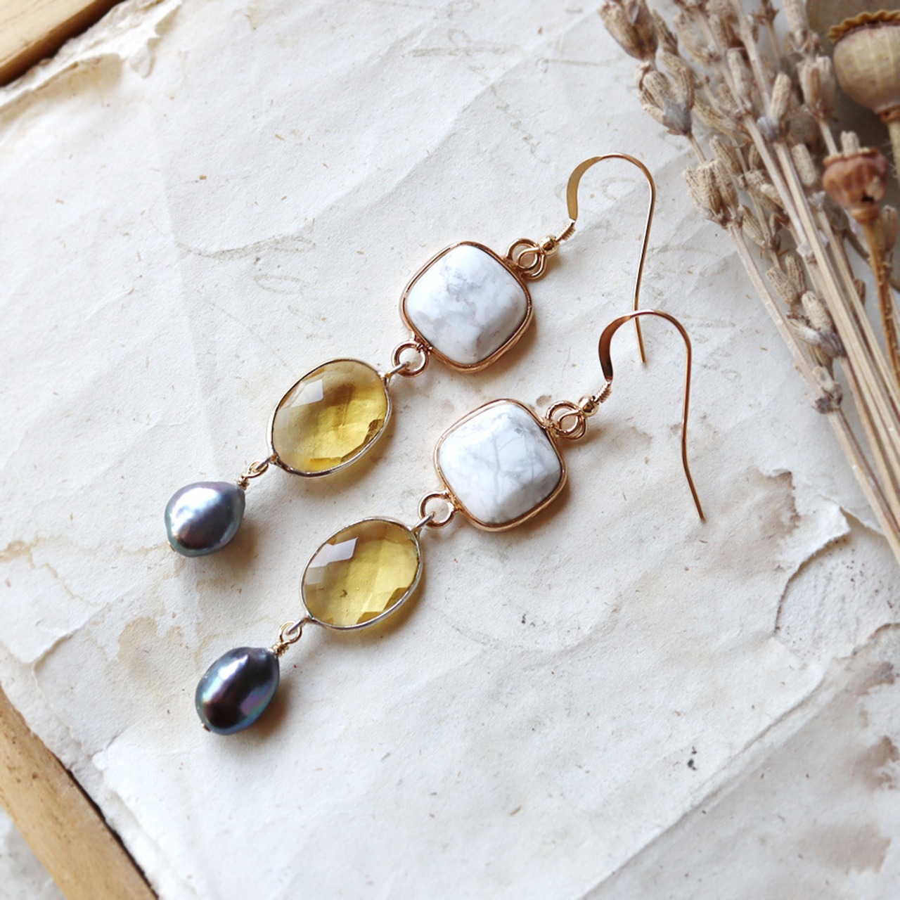 グレーの網目模様が上品なハウライト、鮮やかななイエローのシトリン、シックな艶のグレーパール。