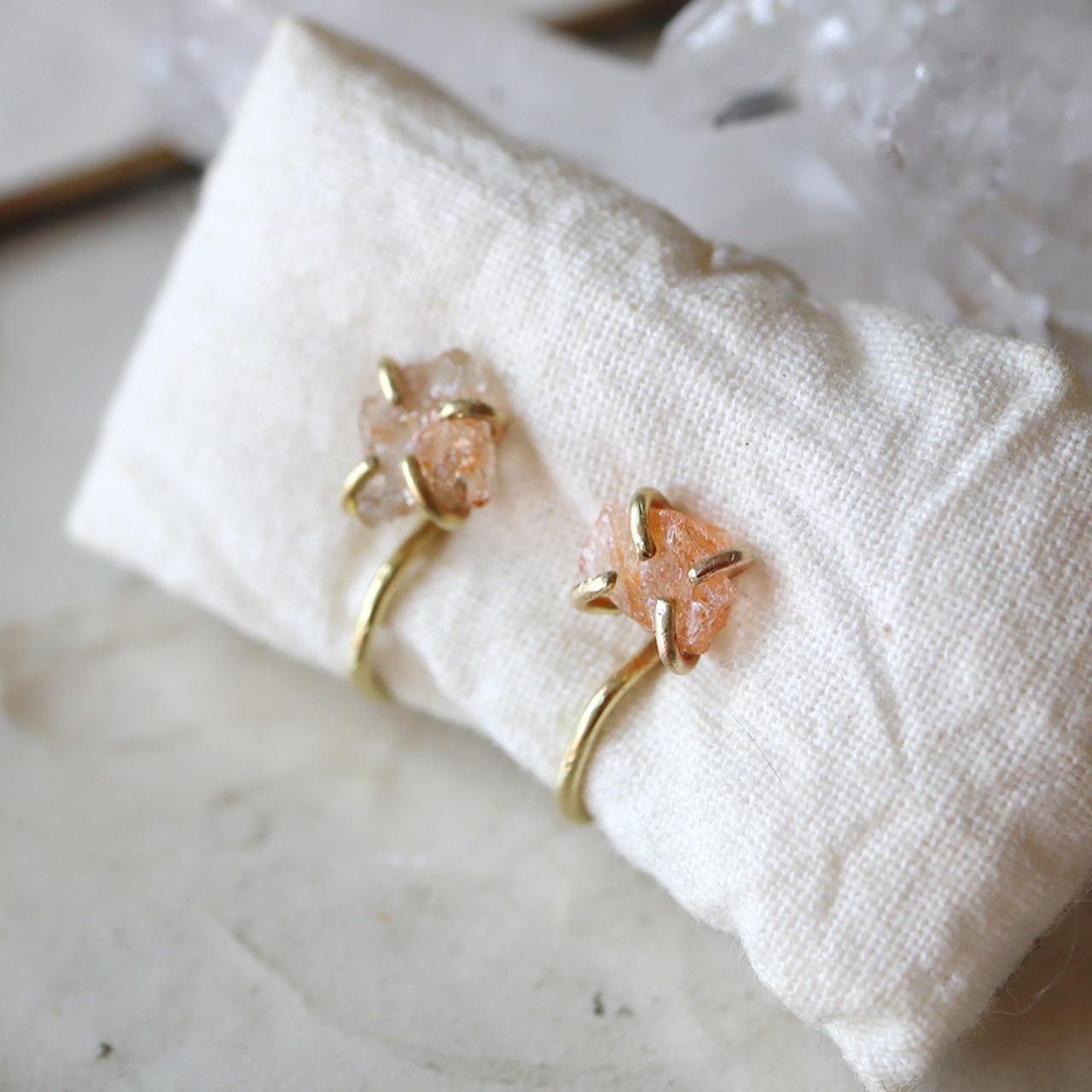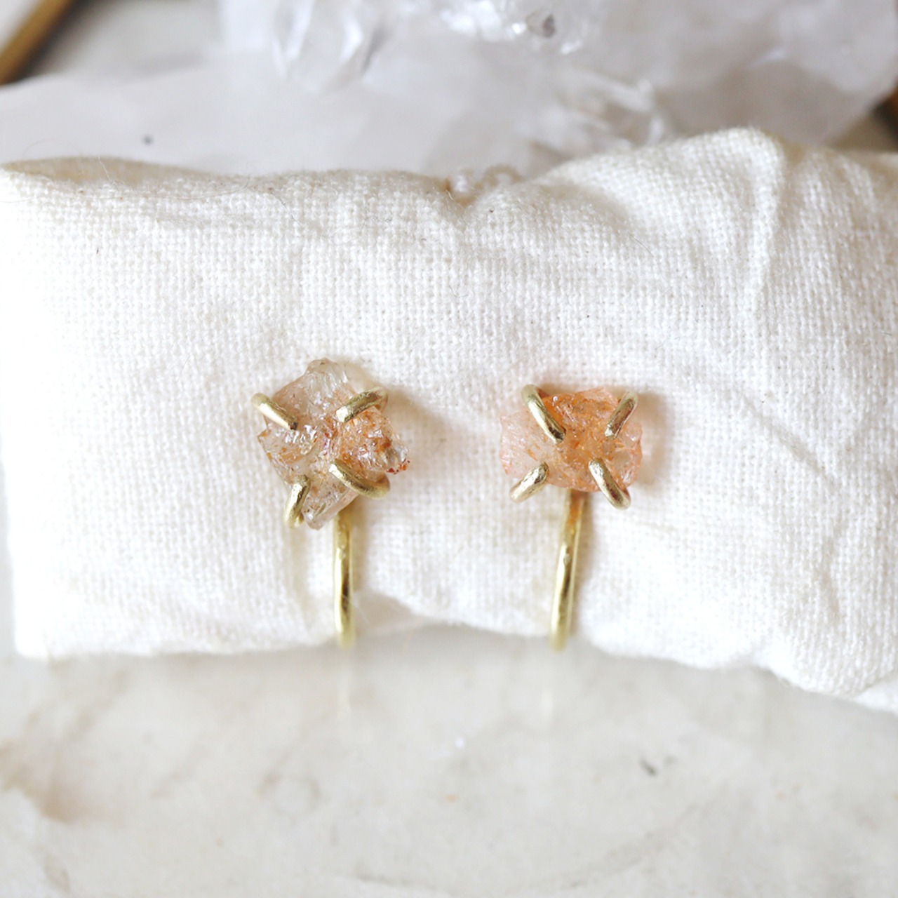 天然石のかけらを真鍮の爪でラフに留めた、シンプルなノンホールピアスです。
