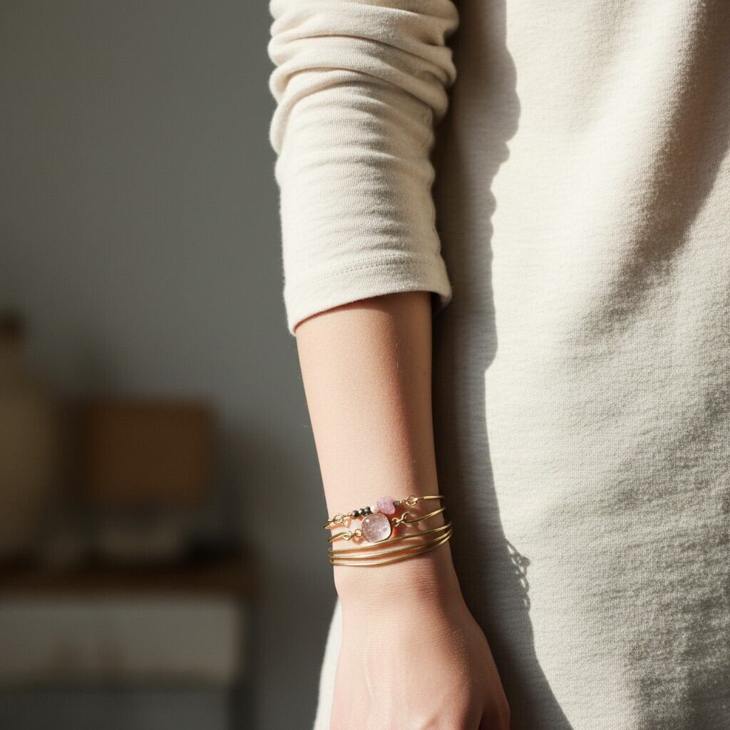 重ね着けがかわいいバングルを、おすすめのセットで組み合わせました。