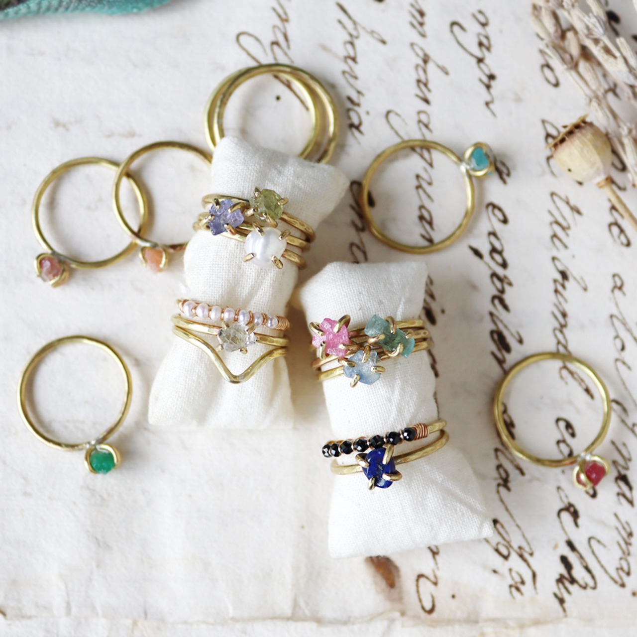 天然石の小さな欠片を真鍮の爪で留めた、シンプルなリングです。