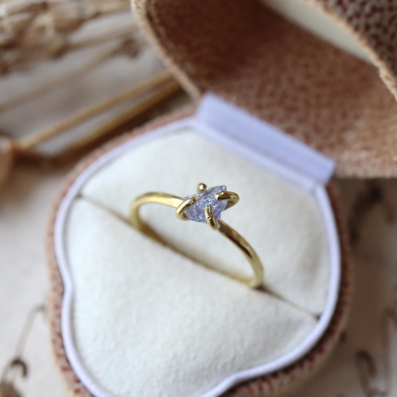 天然石の小さな欠片を真鍮の爪で留めた、シンプルなリングです。
