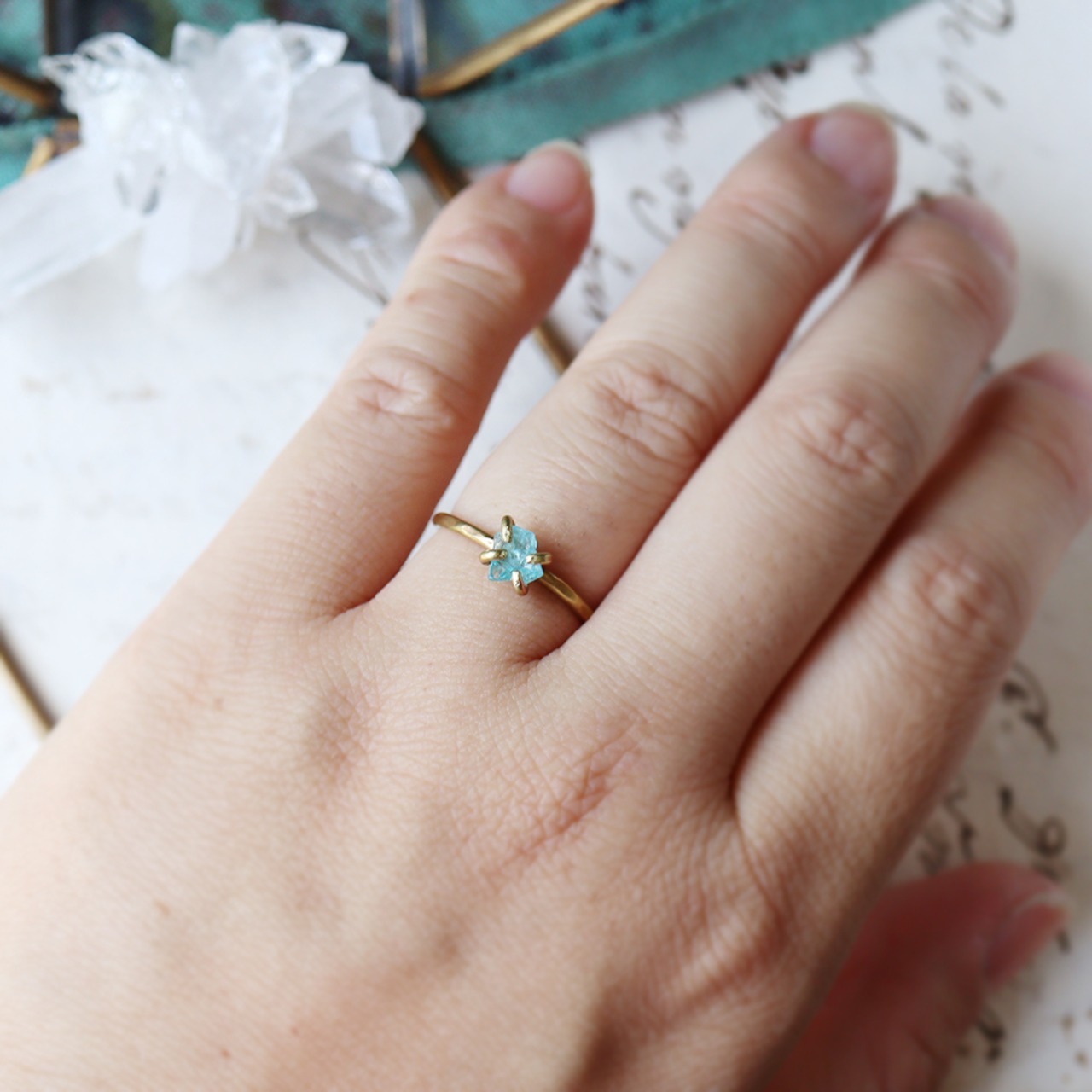 天然石の小さな欠片を真鍮の爪で留めた、シンプルなリングです。