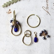 群青色の夜空のようなラピスラズリ、ブーケのように広がるシックなグレーパール、ラフな真鍮のパーツ。
