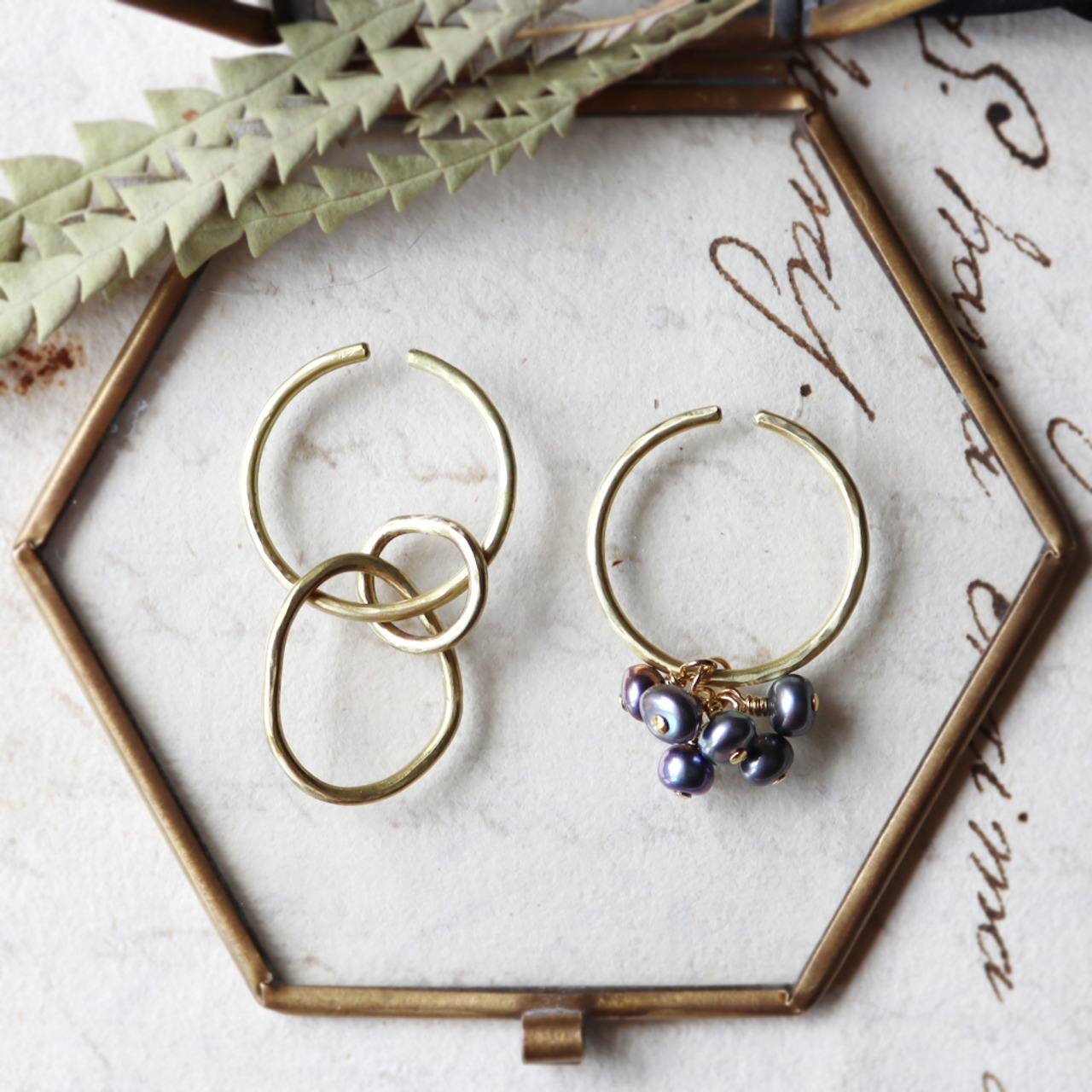真鍮のカフに3種類のパーツがセットになった、組み合わせ自由なアイテムです。