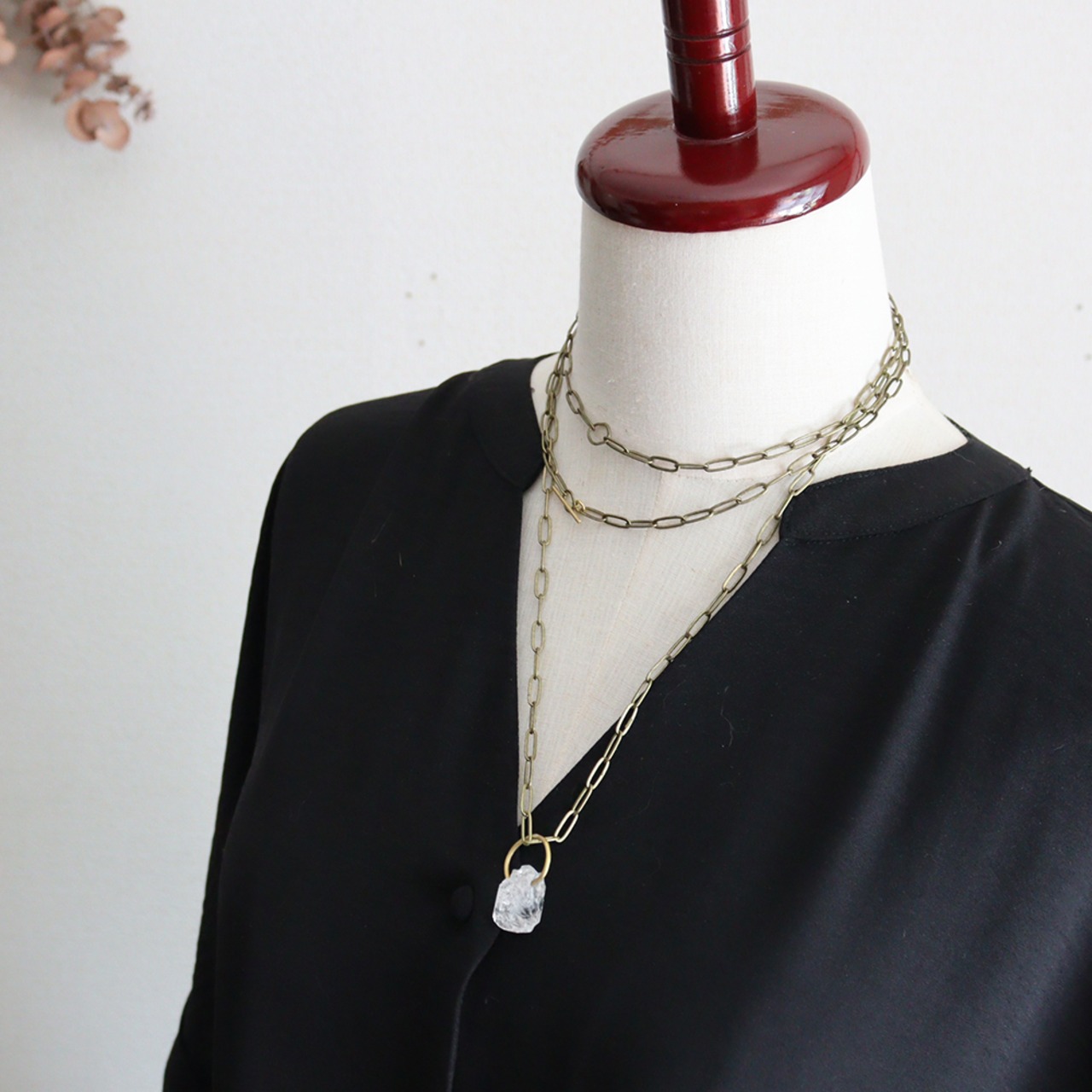 チェーンの途中にある丸パーツの、お好きな部分を留め具としてお使いいただけます。