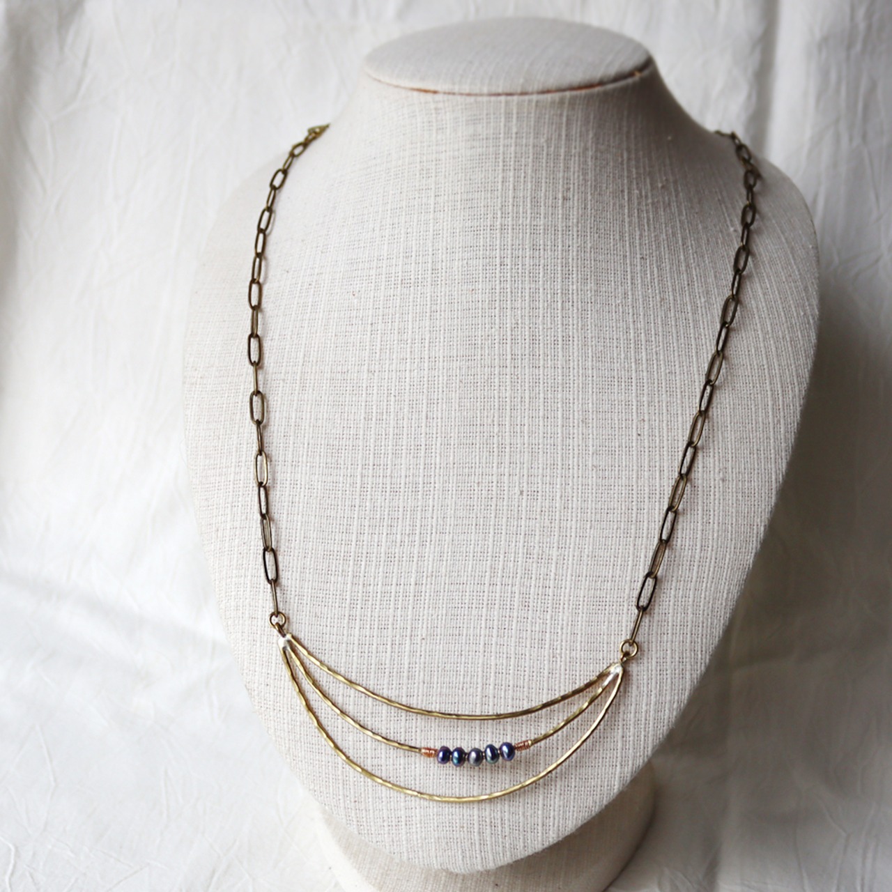 大振りで軽い真鍮のトップに、シックなグレーパールが輝くネックレス。