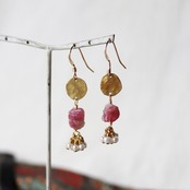 真鍮の満月と、原石らしい色むらとラフな表情のトルマリン、フリルのように揺れる極小パール。
