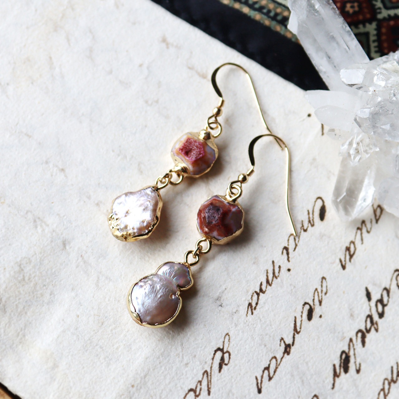 赤い模様が花びらのように広がるアゲートと、ナチュラルな表情が魅力的なパール。