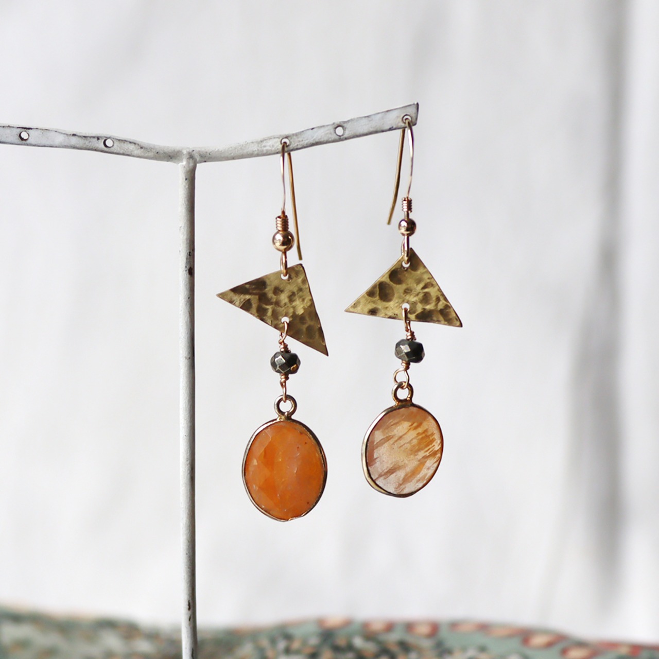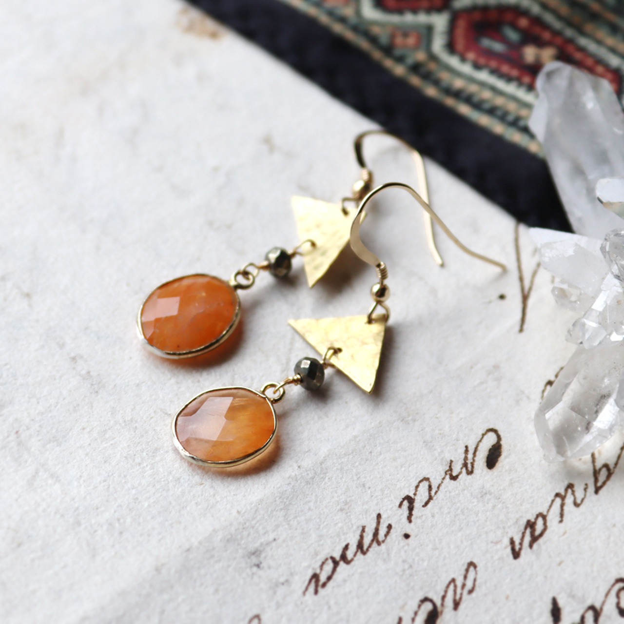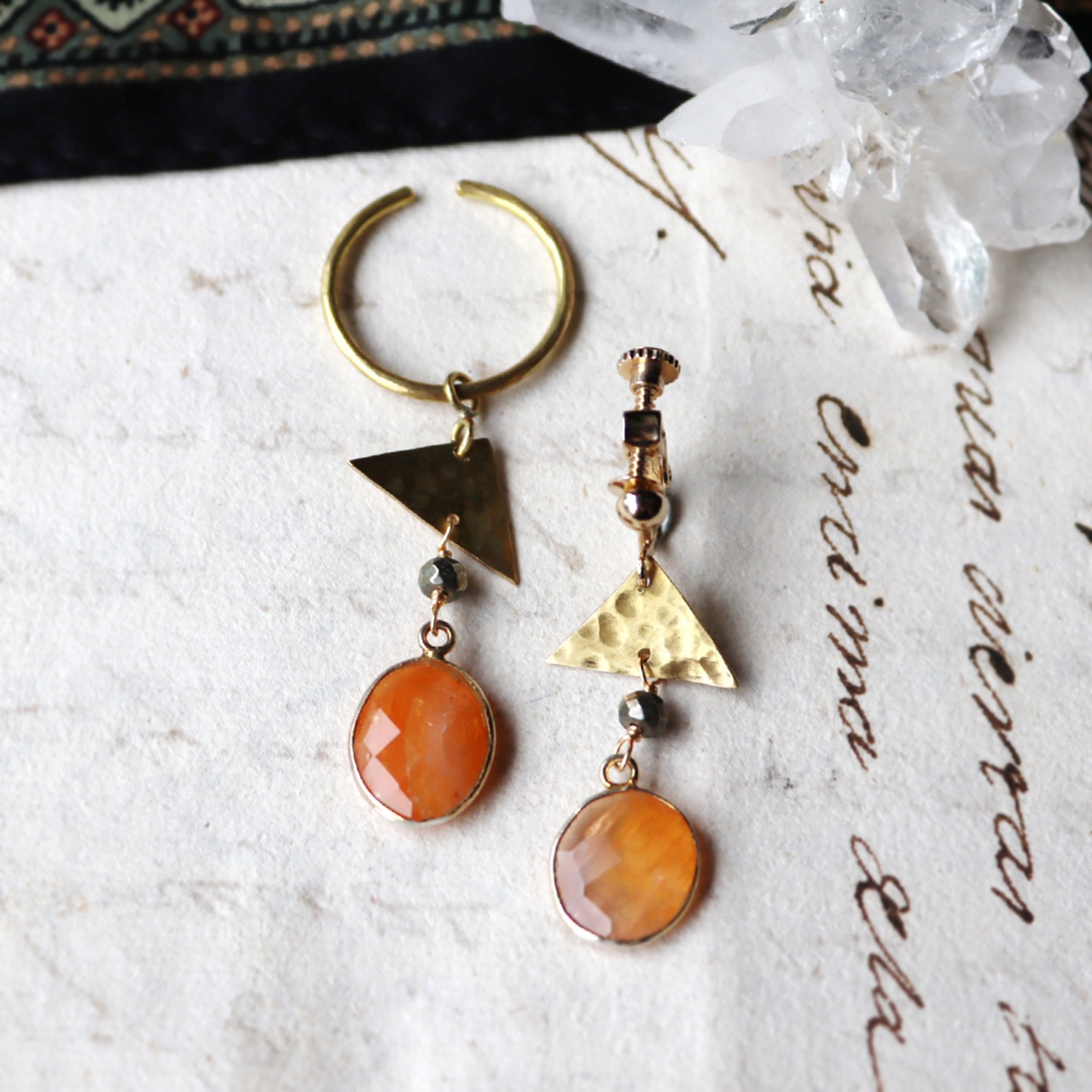 不揃いな三角形の真鍮、金属光沢のある小粒なパイライト、明るいオレンジのマーブル模様が印象的なアゲート。