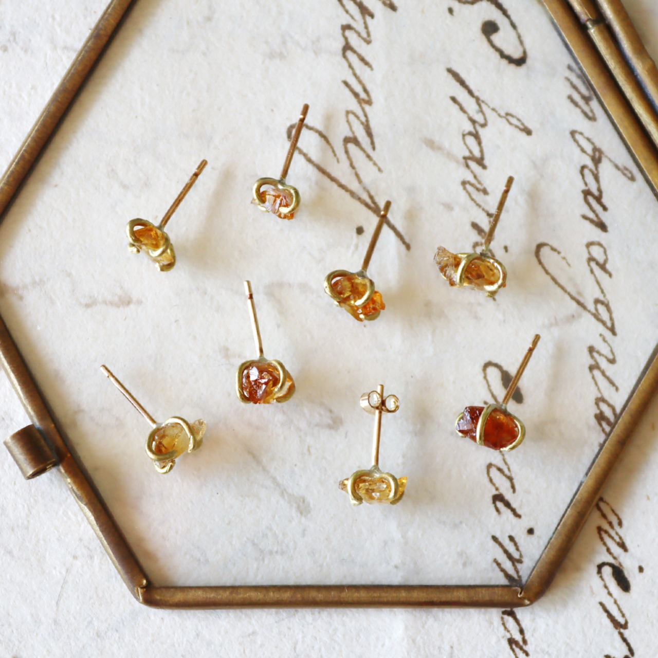 天然石の小さなかけらを真鍮の爪でラフに留めた、シンプルなピアス。