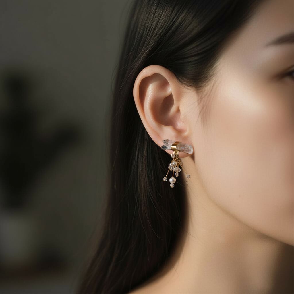 雪の結晶がぱちぱちと小さく爆ぜながら育っていくように、小粒のクォーツとパールが揺れて広がるデザインです。