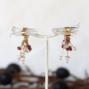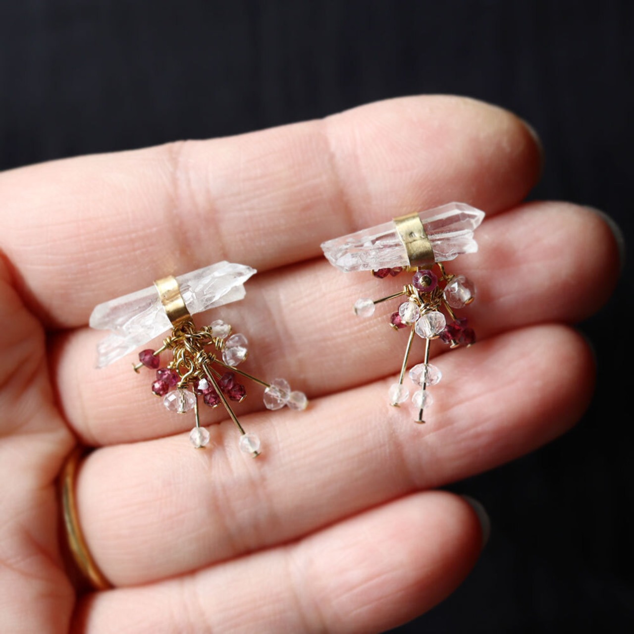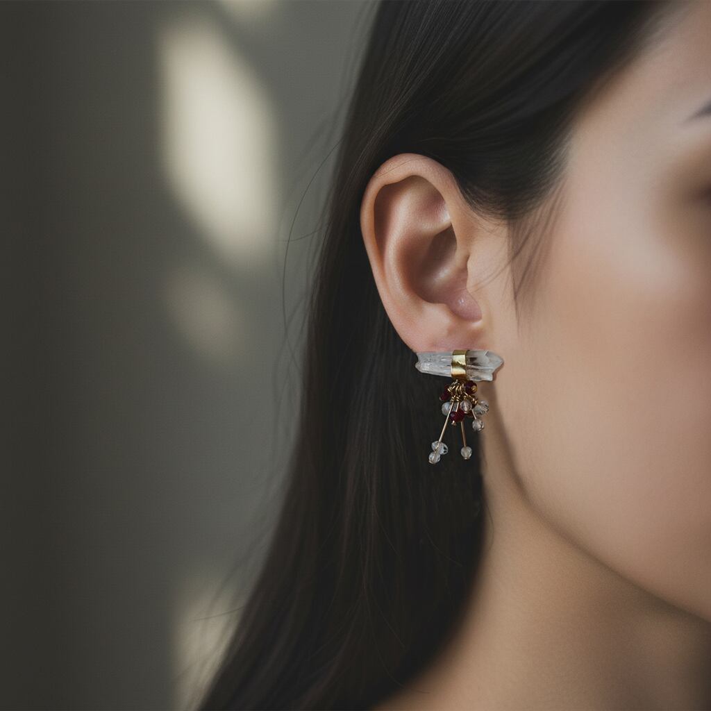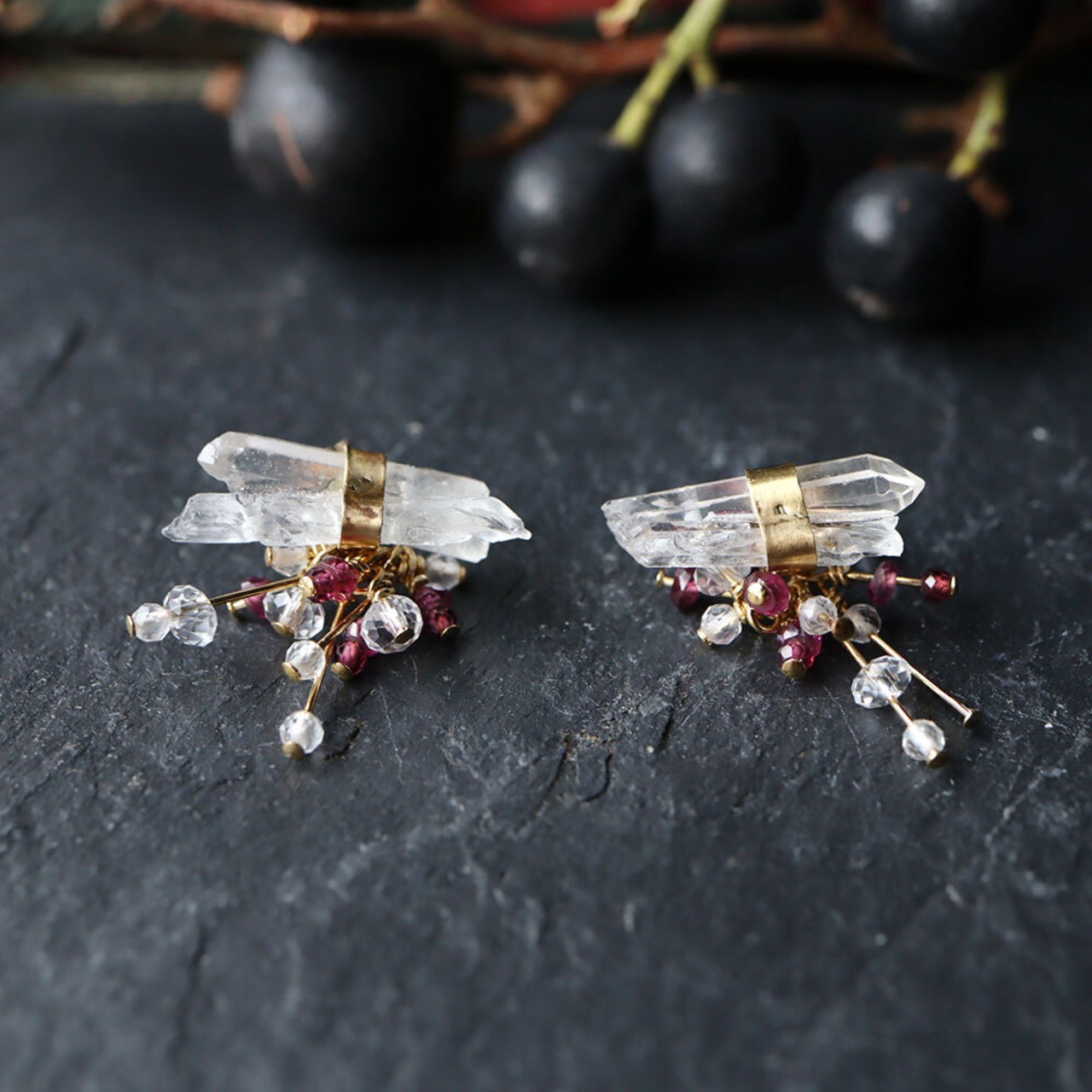 氷の柱のような2本のクォーツ。霜が降りた南天の実から、雪の結晶が育っていくようなピアス。