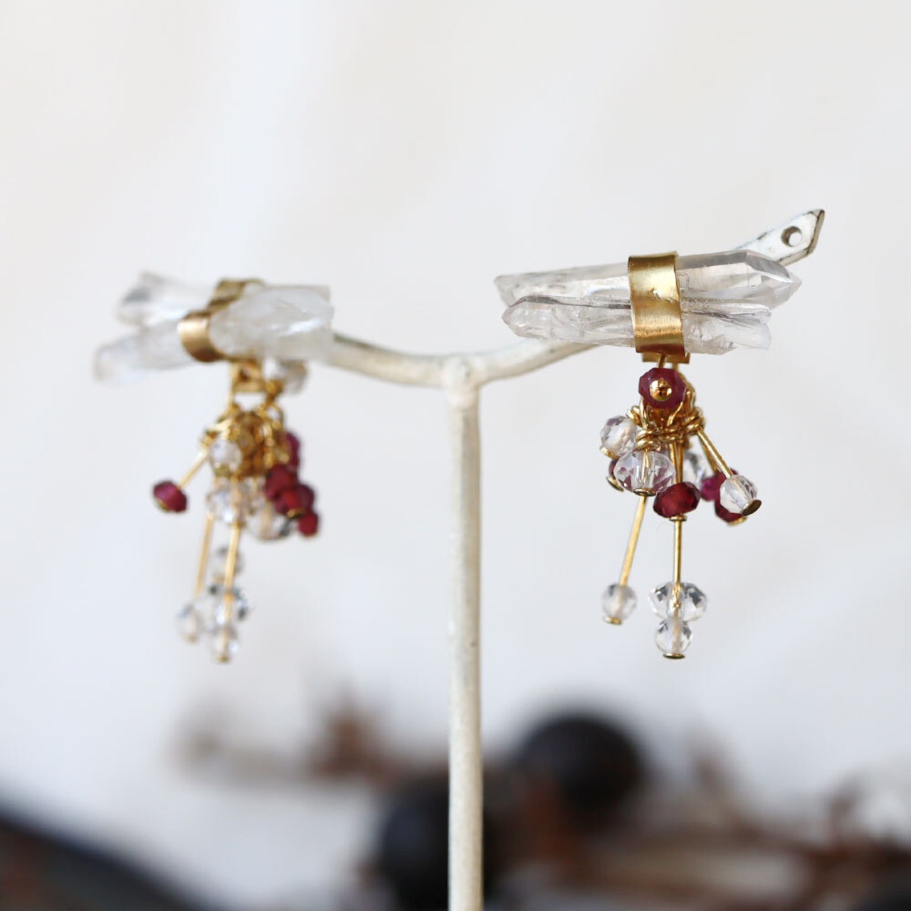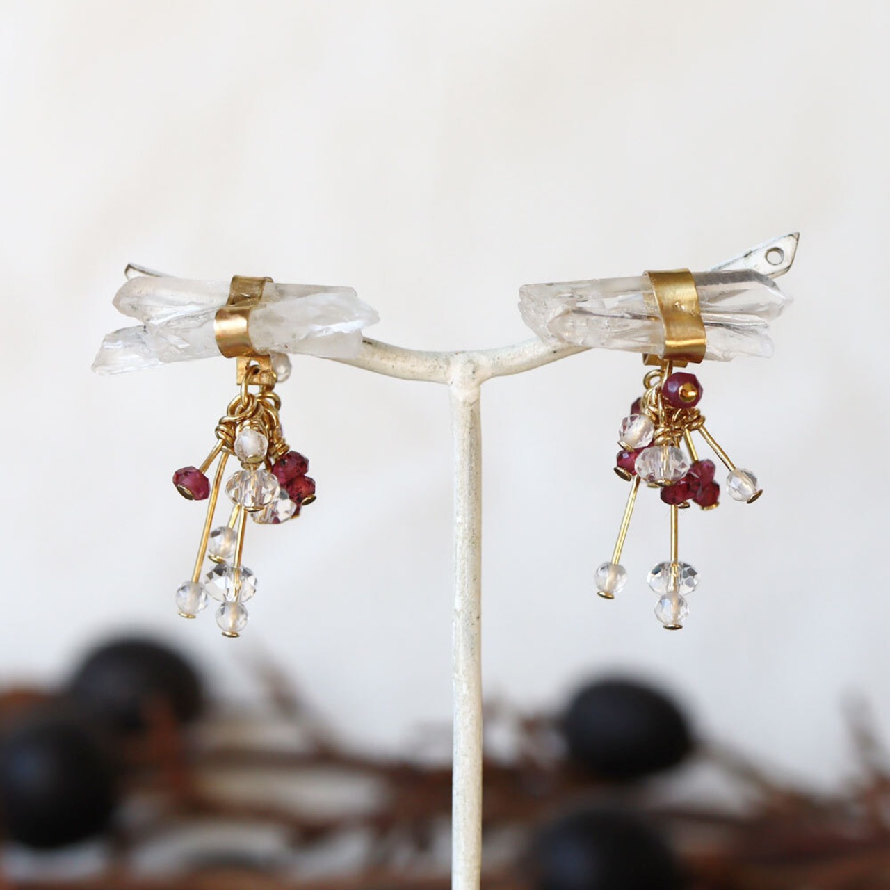赤い実の間を、雪の結晶がぱちぱちと小さく爆ぜながら育っていくように、小粒のガーネットとクォーツが揺れて広がるデザインです。