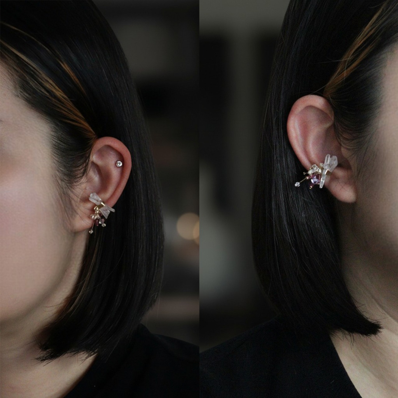 左耳に着けると結晶が下に広がり、右耳に着けるとクォーツの上に集まるような印象になります。