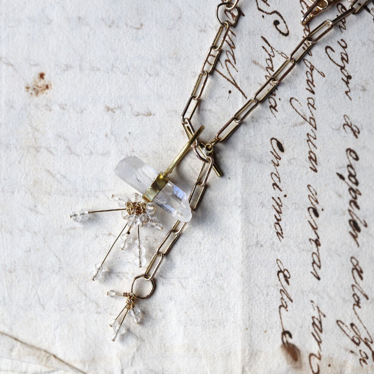 氷の柱のようなクォーツから、雪の結晶が育っていくようなネックレス。