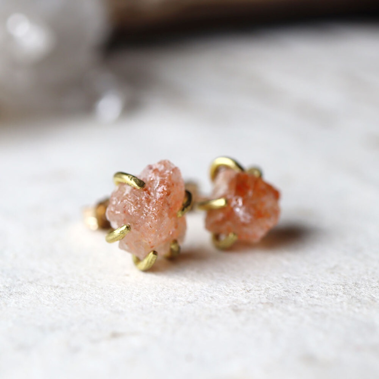 原石の形をそのままに真鍮の四本爪でラフに留め、シンプルなピアスにしました。