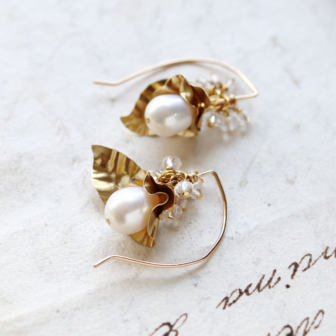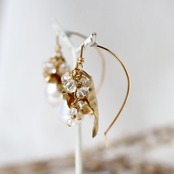 まろやかな輝きのドロップパールと小粒のクォーツを合わせた、耳元をブーケで飾るようなピアス。