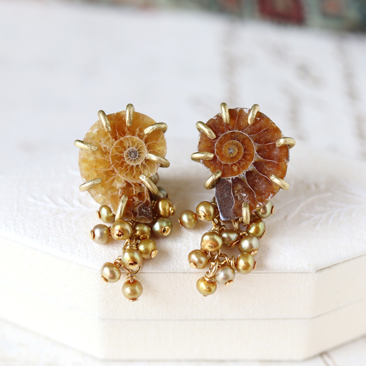 素材:アンモナイト(中生代白亜紀)・真鍮・K14ゴールドフィルド(ピアス金具)