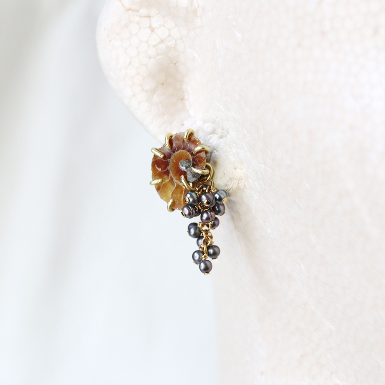 ベビーパールのチャームを合わせると、まるでそこに生きていたアンモナイトが触手を伸ばすよう。