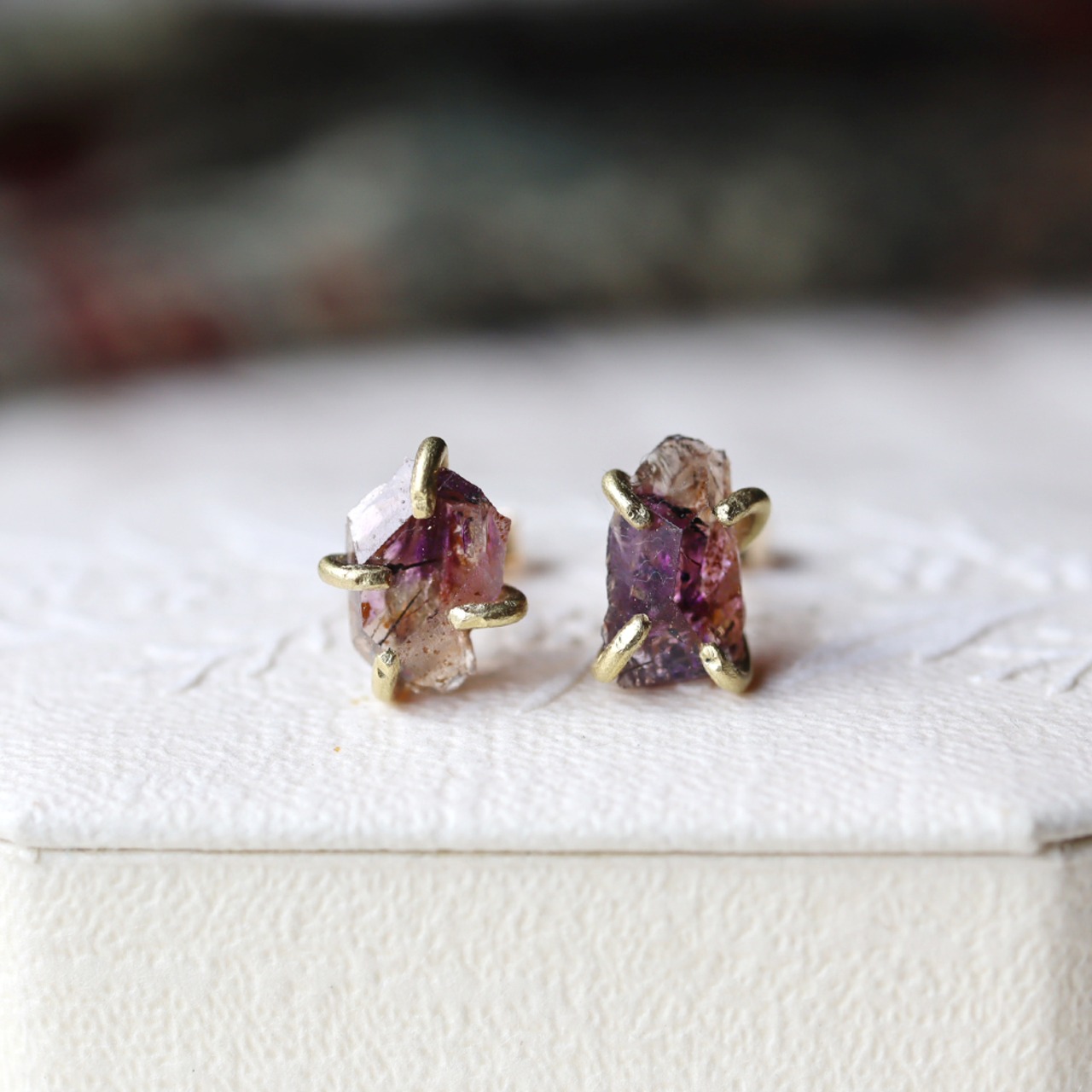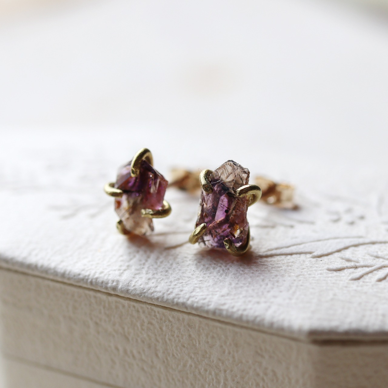 原石の小さなかけらを真鍮の爪でラフに留めた、シンプルなピアスです