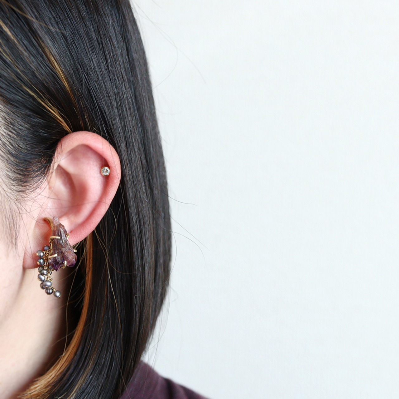 覗き込みたくなるような存在感のある原石が、指の上・耳たぶに横たわる個性的なデザイン。