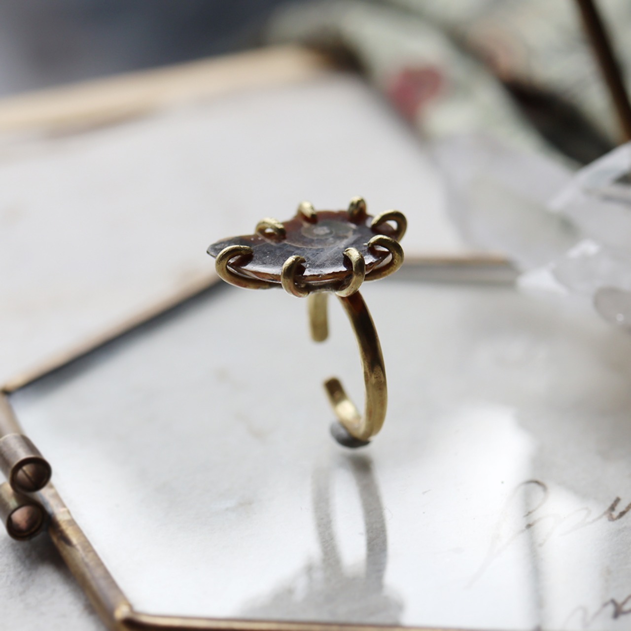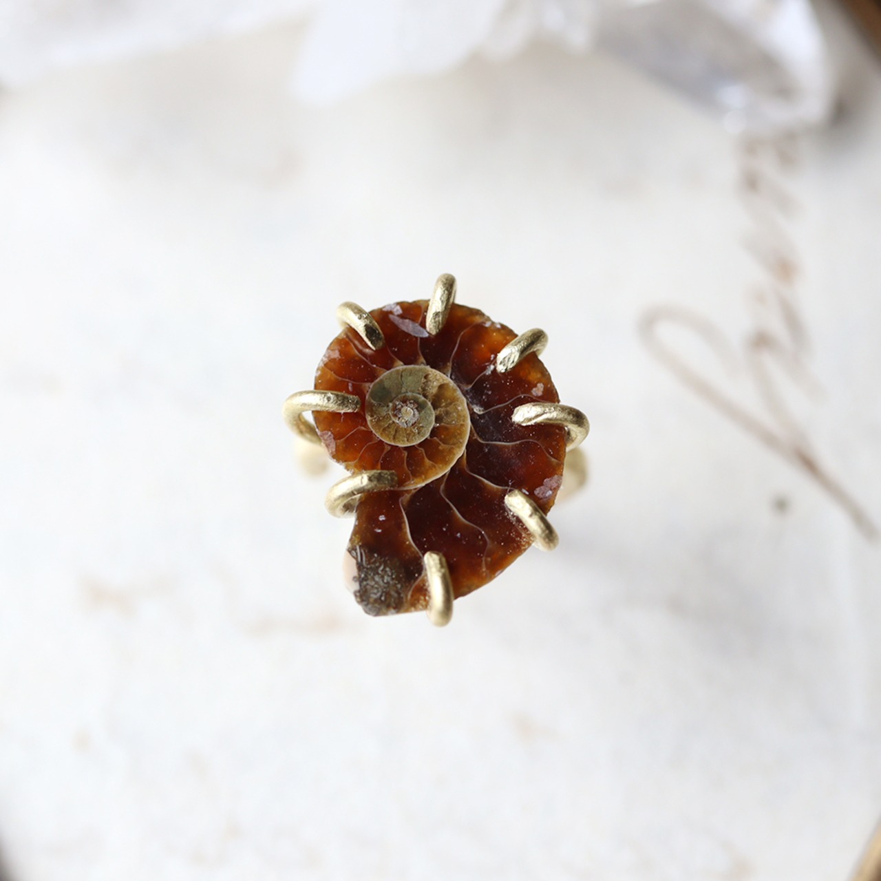 化石を半分にスライスした状態を、真鍮の爪で有機的に留めてイヤーカフにしました。