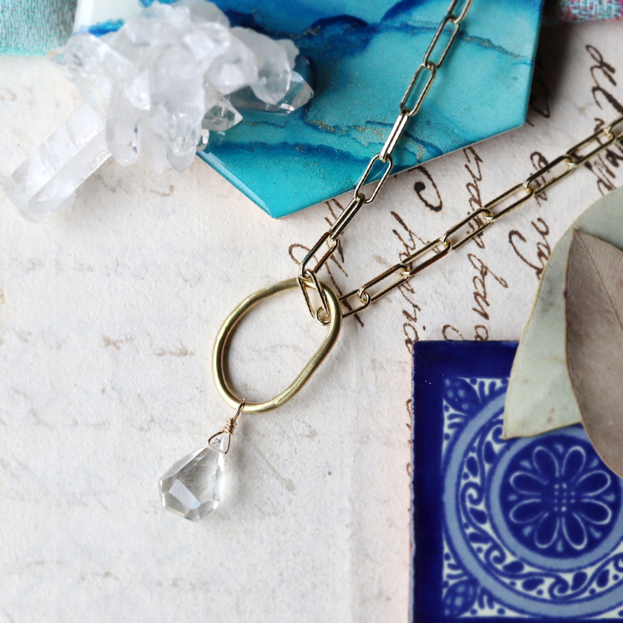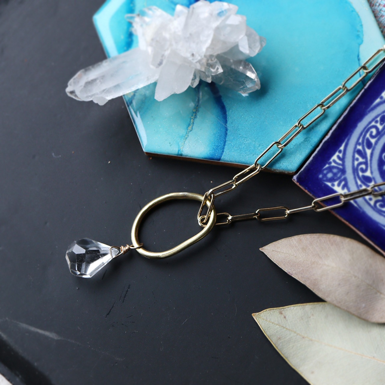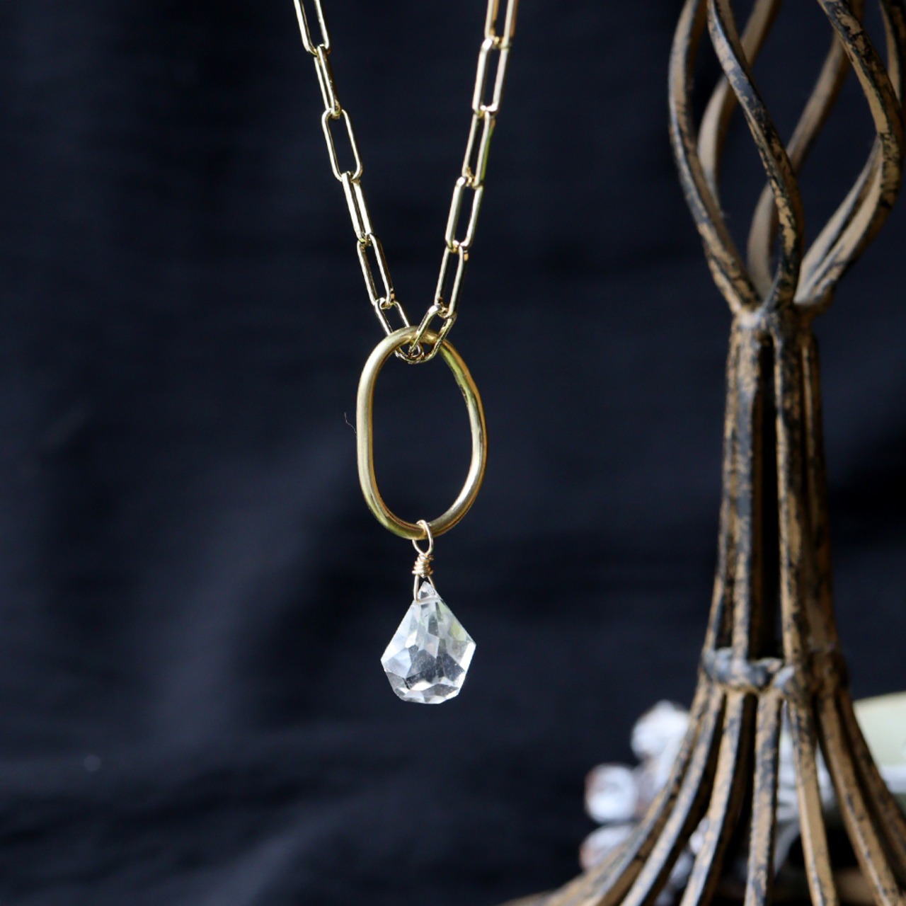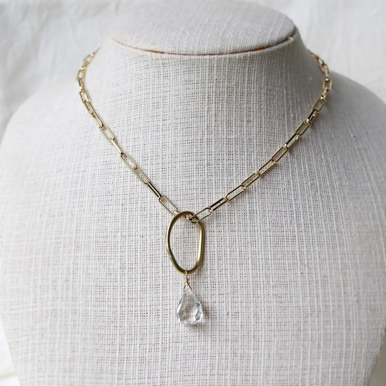 ゆるい真鍮のわっかに、氷の雫のようなクォーツがぶら下がるシンプルなネックレス。