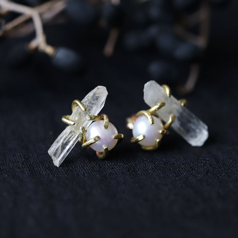 クォーツ結晶とパールのピアス