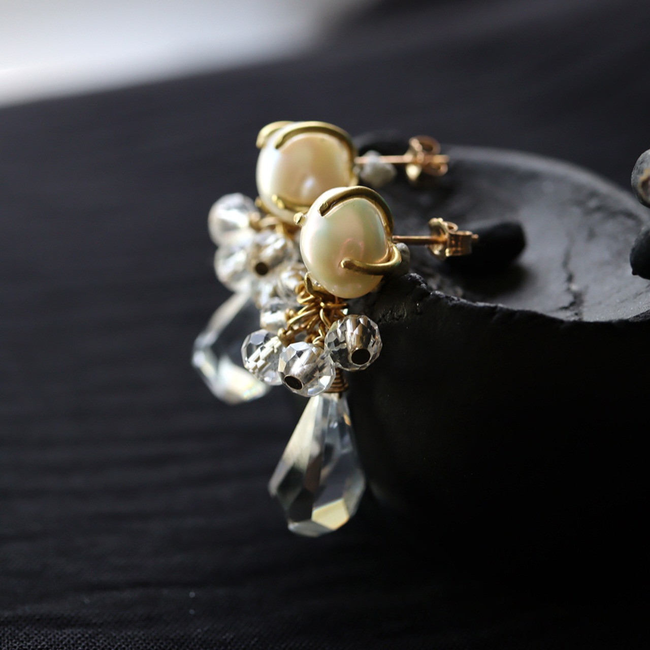 小粒クォーツとドロップ型クォーツは動くたび耳元で揺れ、光を取り込んできらきらと輝きます。