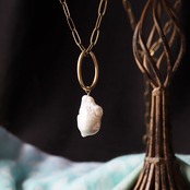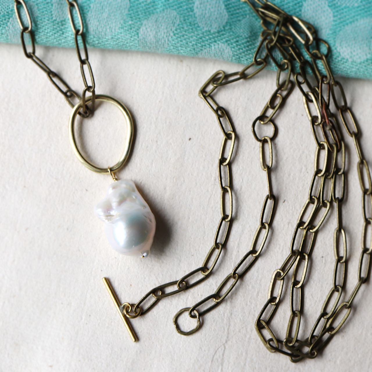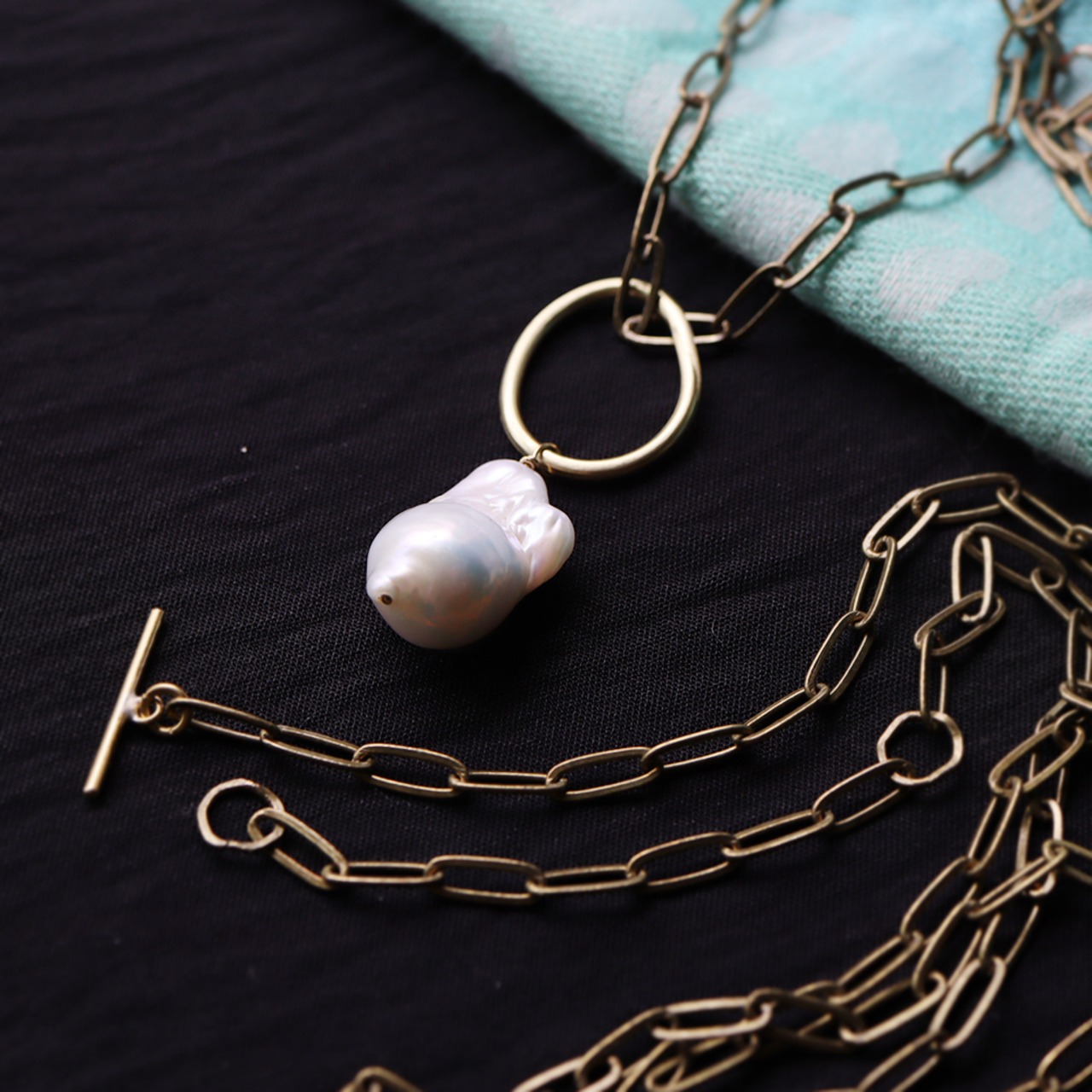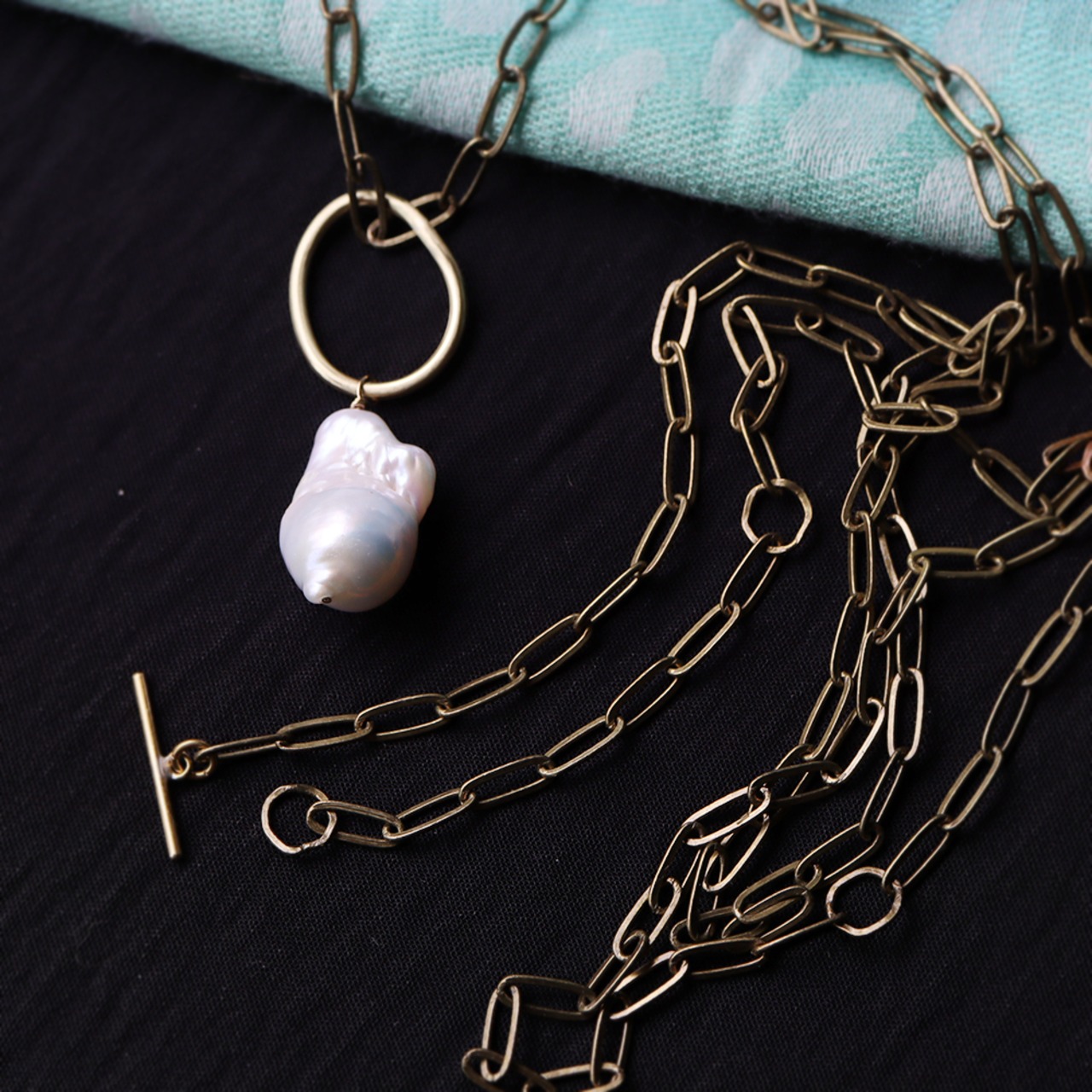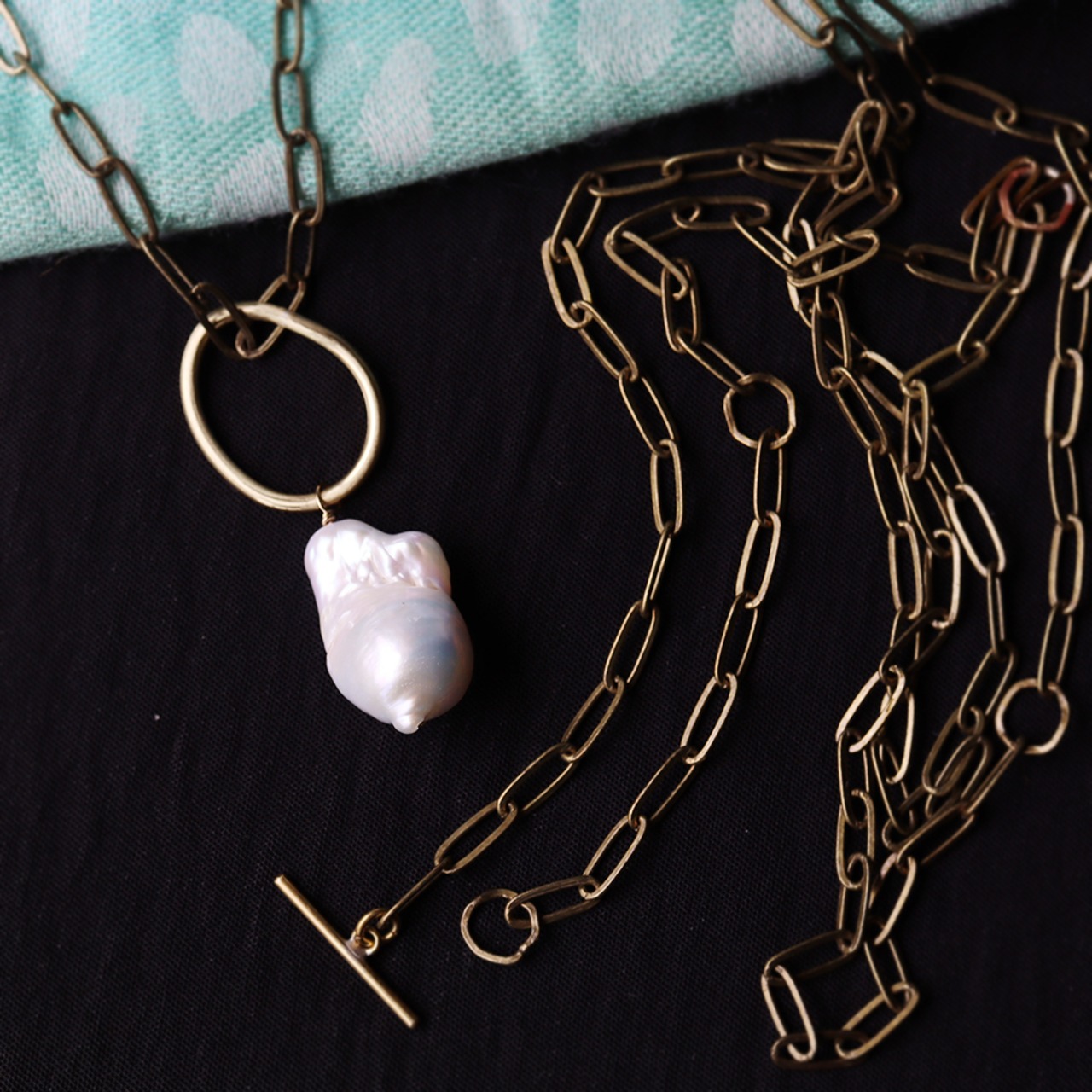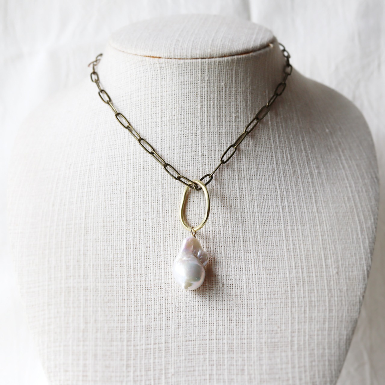 ゆるい真鍮のわっかに、存在感のある大粒のバロックパールがぶら下がるシンプルなネックレス。