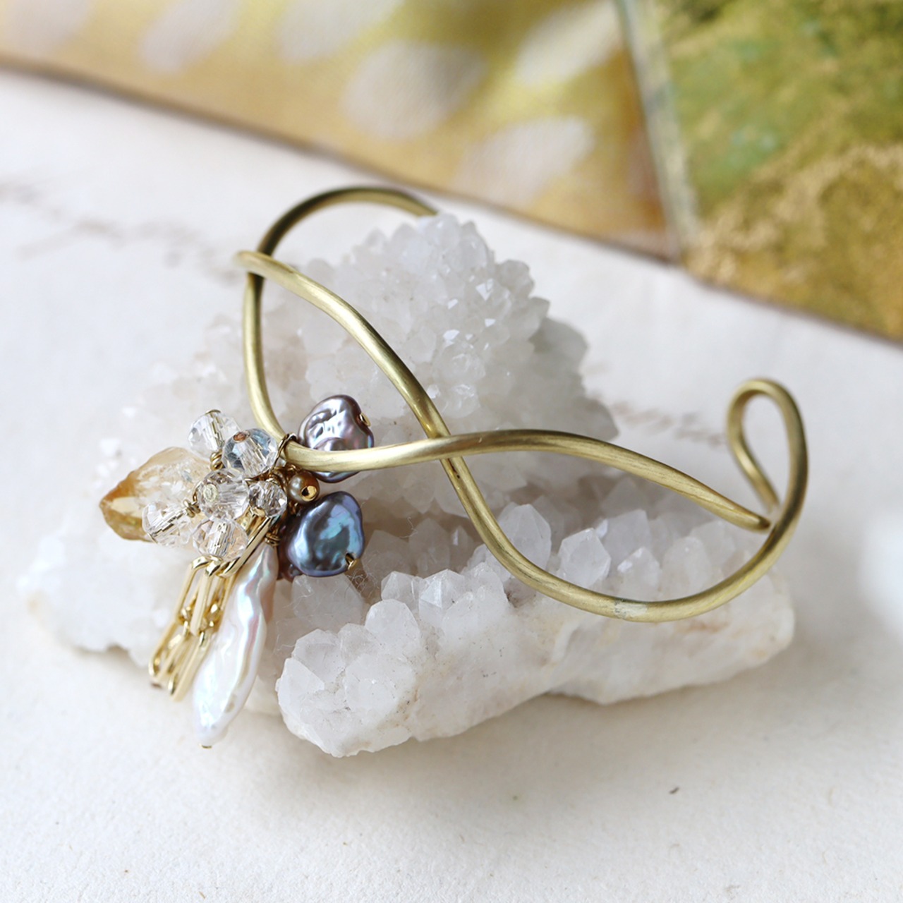 原石シトリン・クォーツ・パールのなみなみバングル