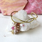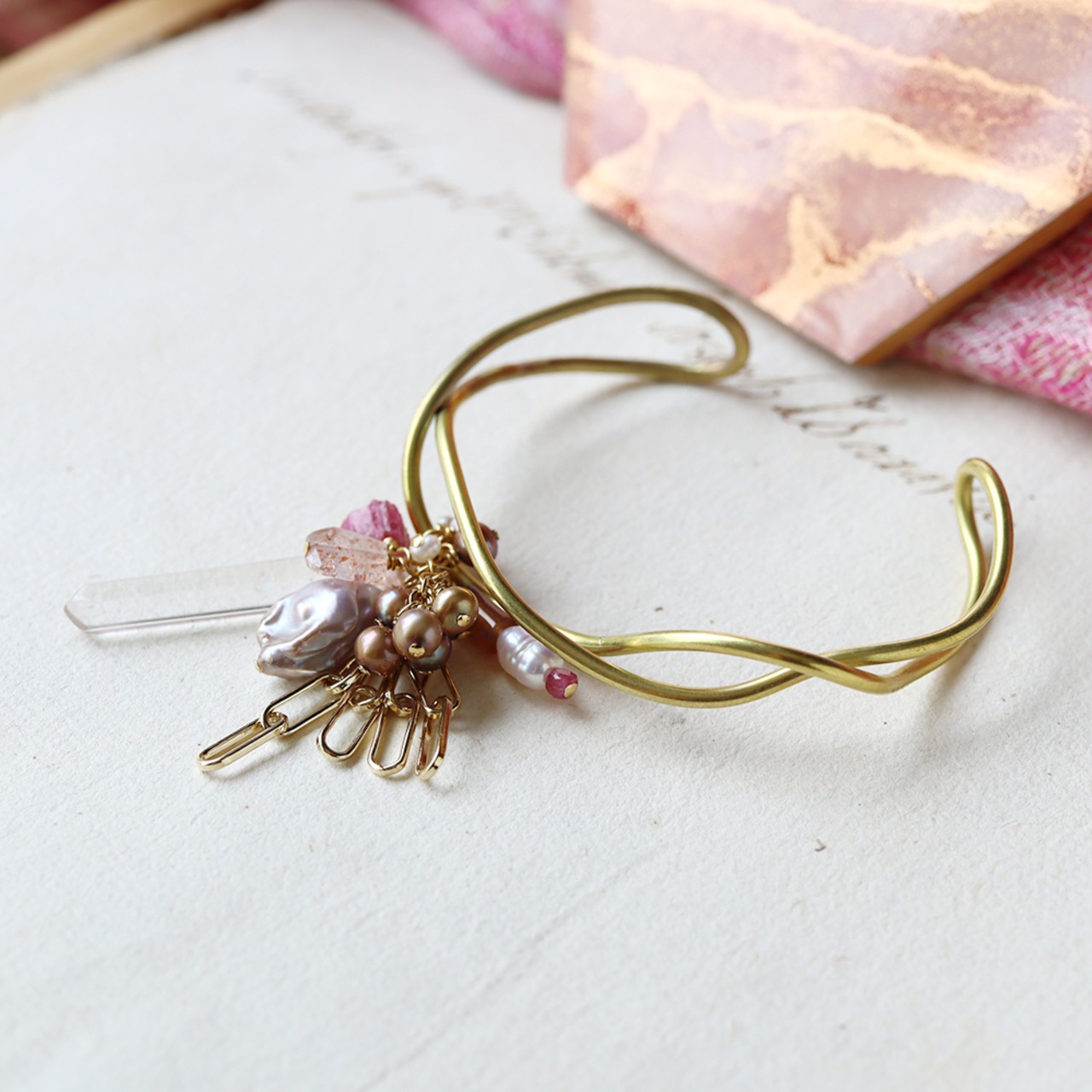 原石ピンクトルマリン・クォーツ・パールのなみなみバングル