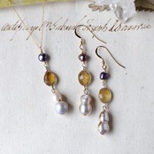 シックなグレーパールと、こっくりした柑橘系の色味、天然の傷に光が反射して輝くシトリン。双子パールは雪だるまのような可愛い形に、ゴールドの縁取りがアクセント。