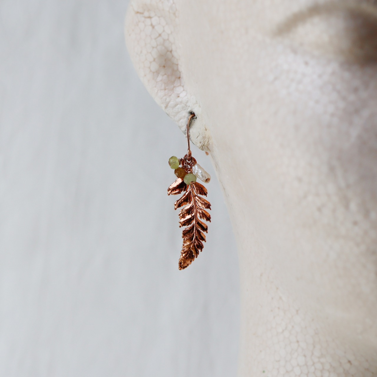 素材である銅は、赤みのある金色があたたかく、使い込む程にアンティークな質感へと変化していきます。動くたび揺れ、自然の美しさで耳元を飾ってくれるアイテムです。
