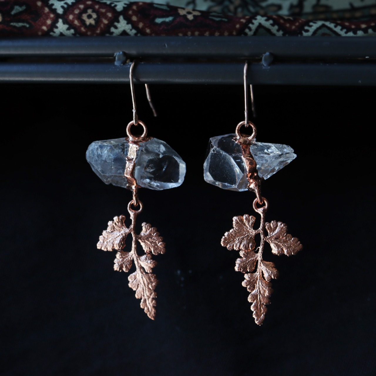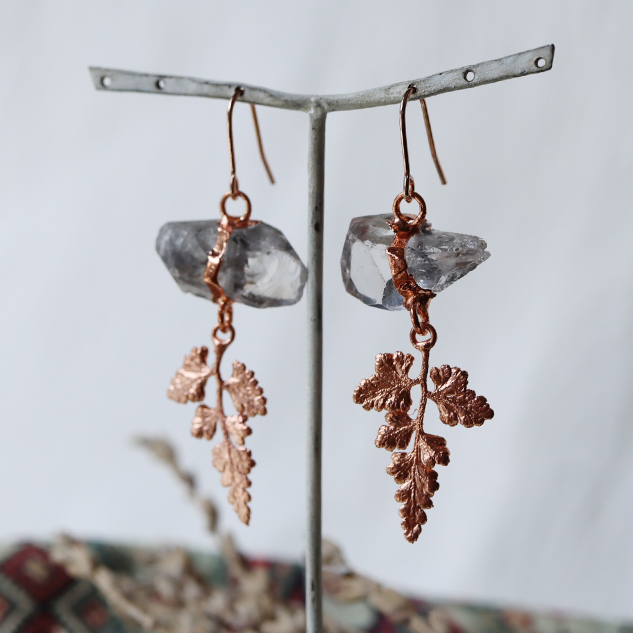大粒のクォーツ原石から、シダの葉が生い茂るようなピアス。
