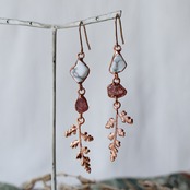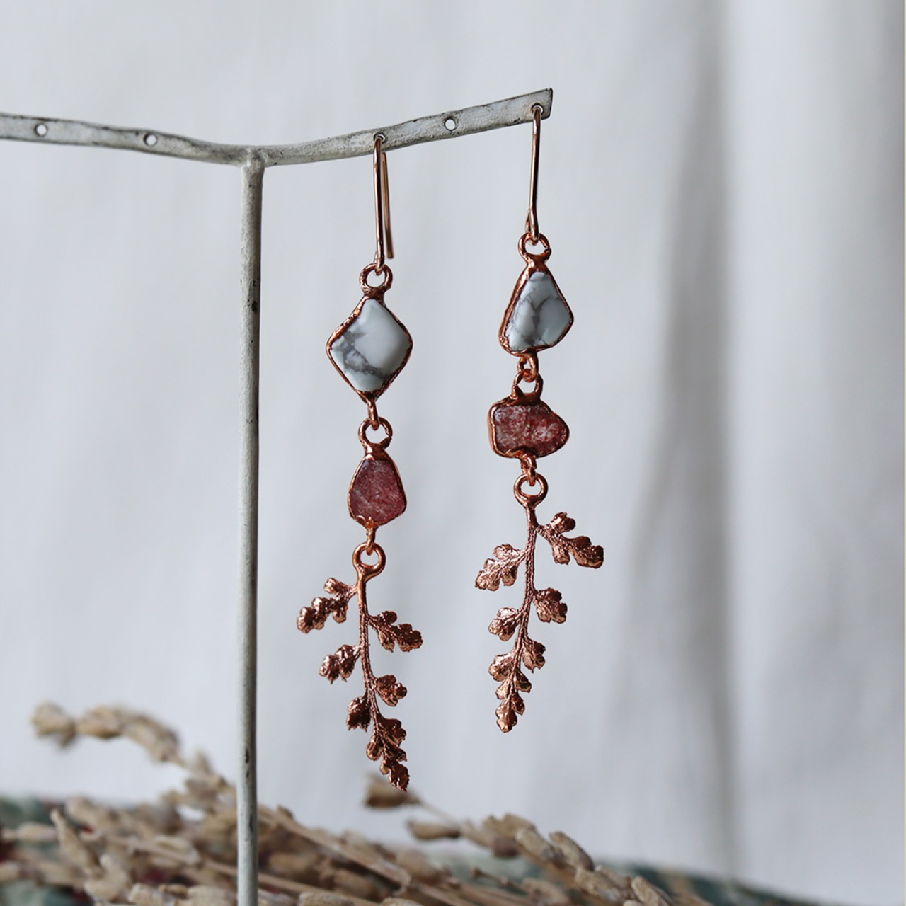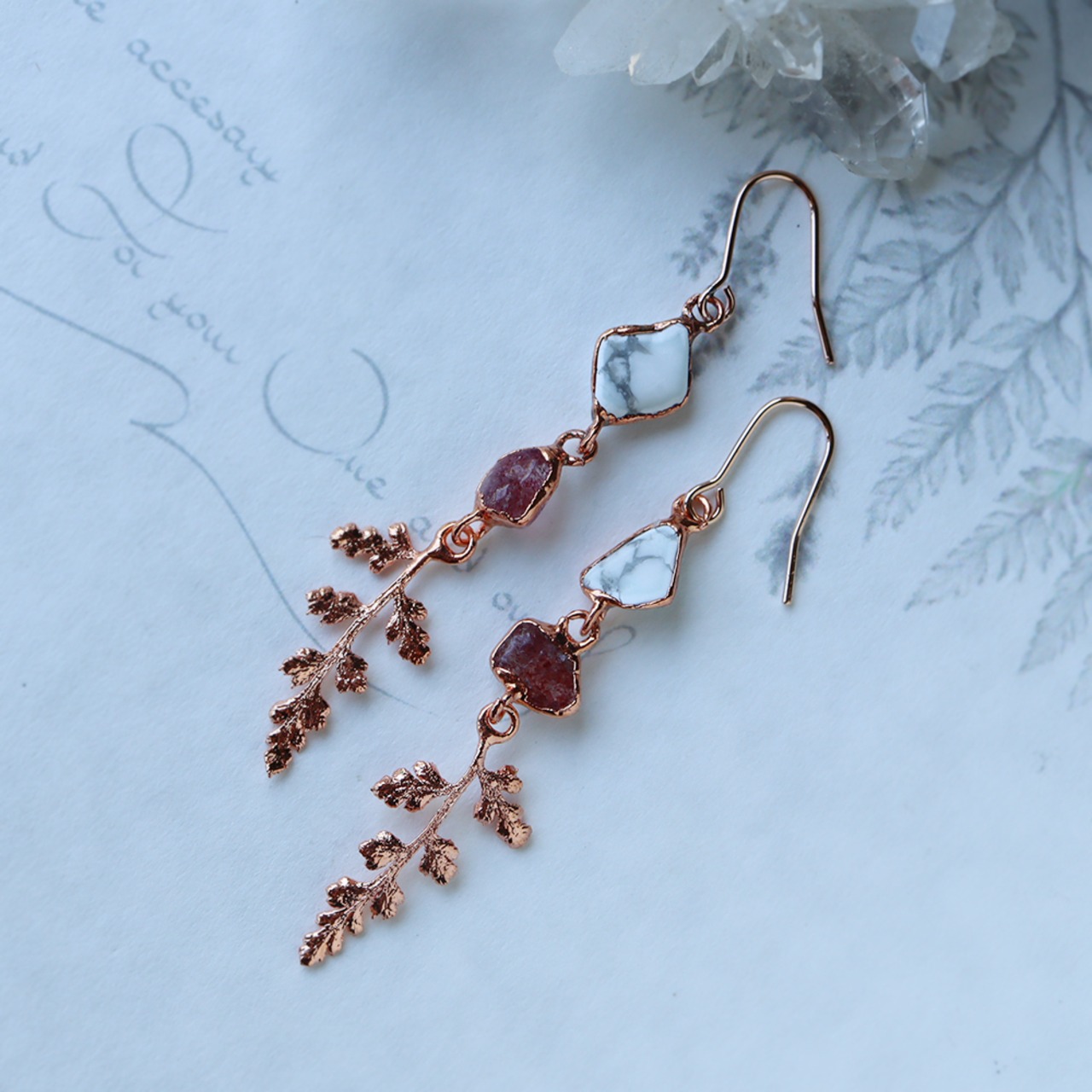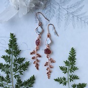 零れ落ちる天然石の雫から葉っぱが生い茂るようなピアス。マットな白地にグレーの網目が入るハウライトと、透明の中に赤い内包物が浮かぶエピドート、葉っぱはツルシノブという植物です。