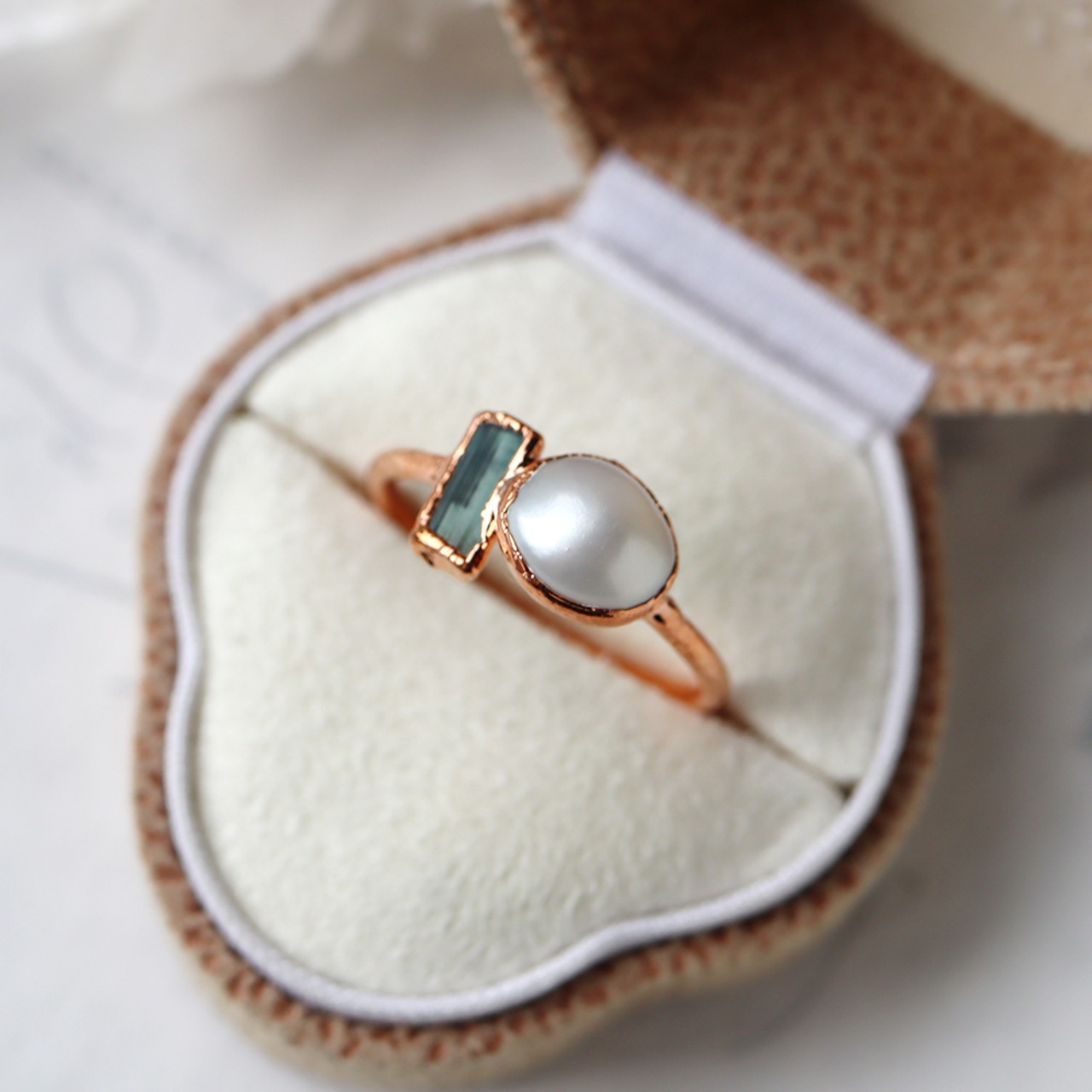 原石と楕円型のパール、銅の石枠が作り出すナチュラルでラフな輝きが、手元を柔らかく飾るリングです。