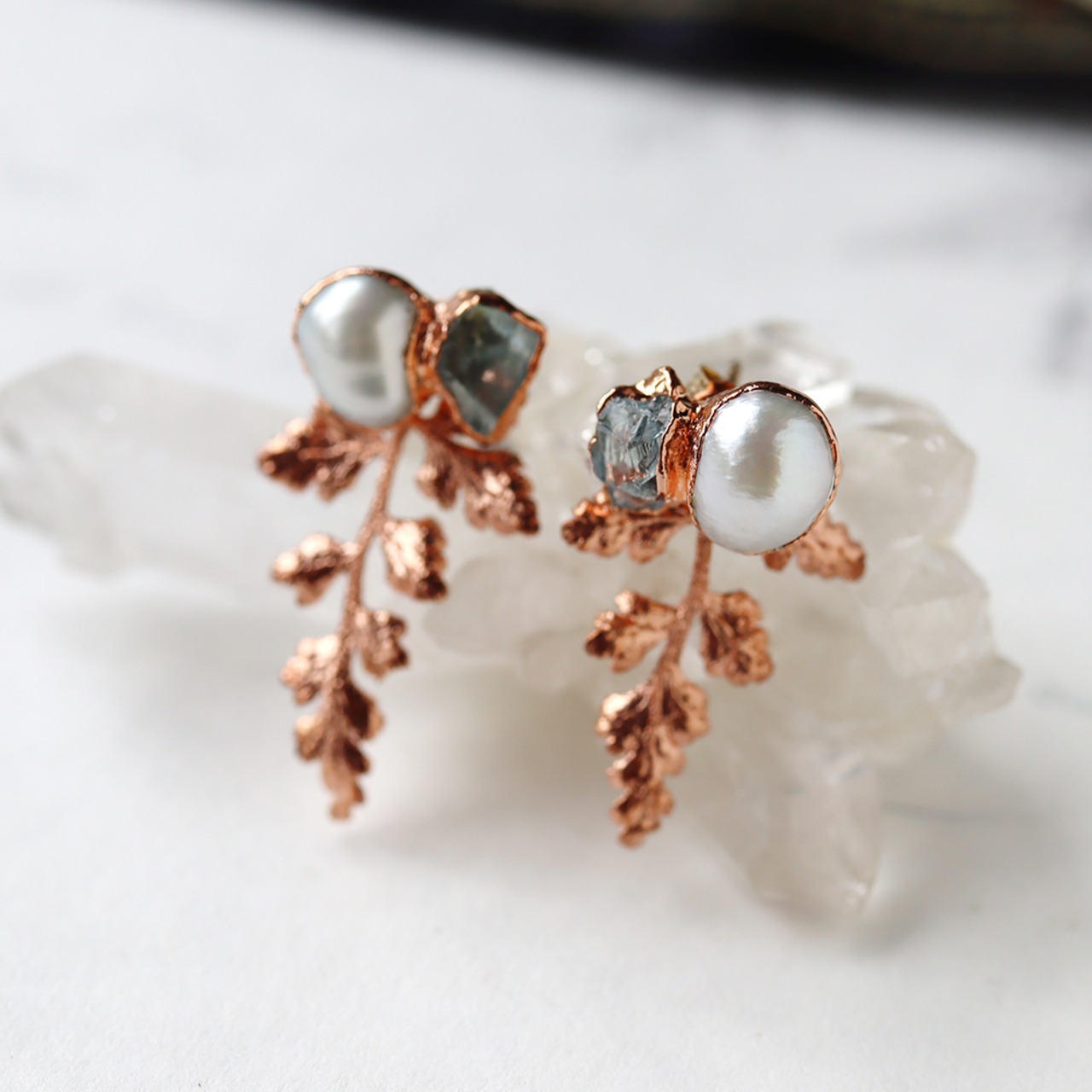 素材である銅は、赤みのある金色があたたかく、使い込む程にアンティークな質感へと変化していきます。天然石のラフな輝きと植物の造形。自然そのままの美しさで耳元を飾るアイテムです。