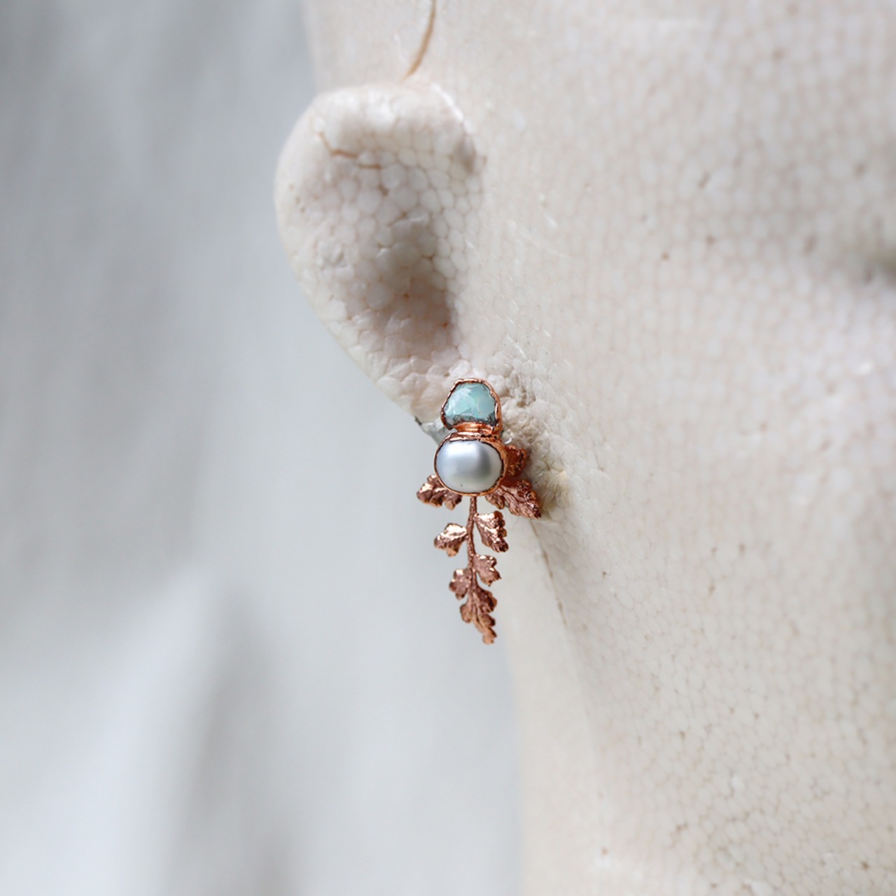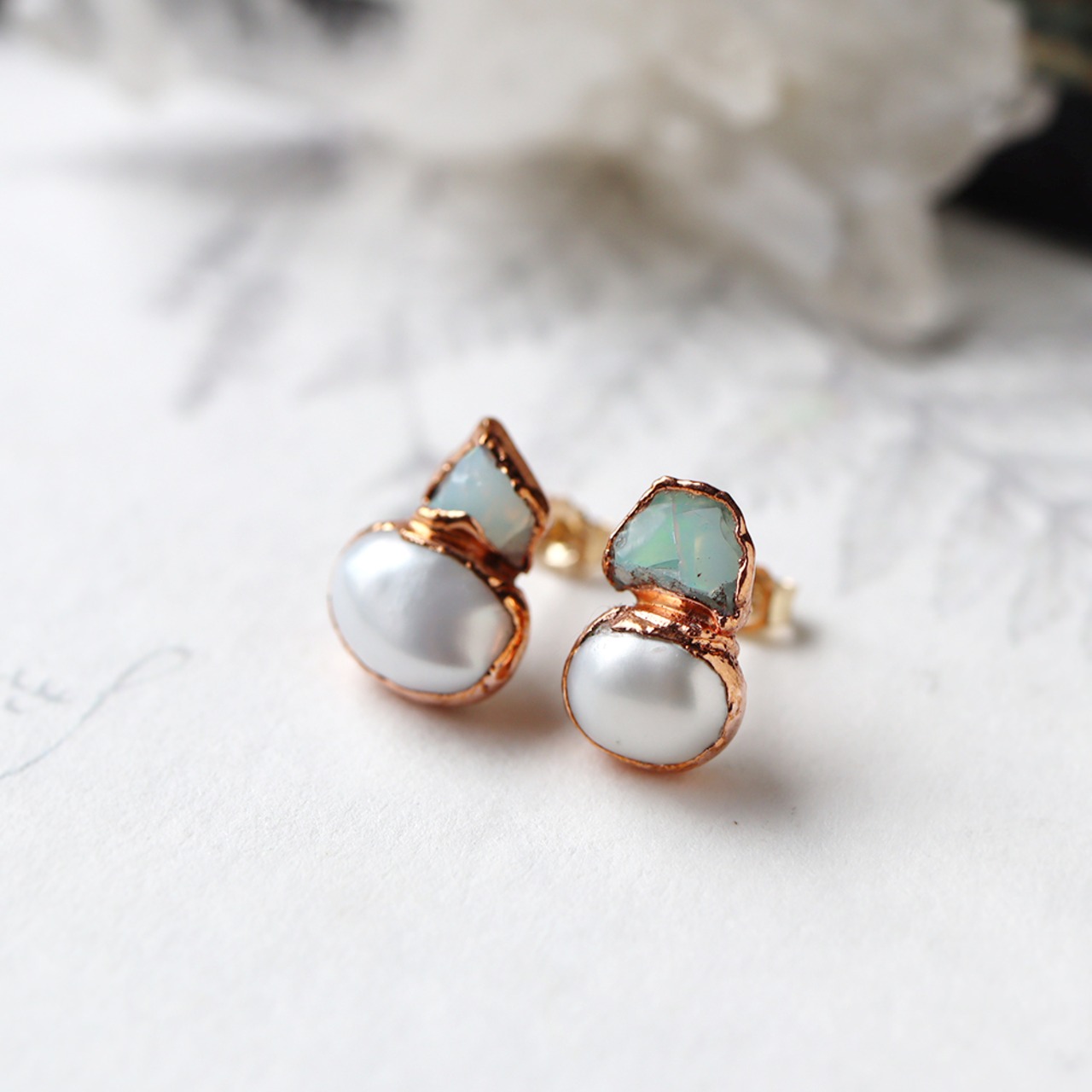 乳白色の中にグリーン・オレンジ・イエローの遊色がフラッシュのように光るオパールと、自然な丸み、上品な艶が美しいパール。天然石のピアストップから葉っぱが生い茂るようなピアスです。