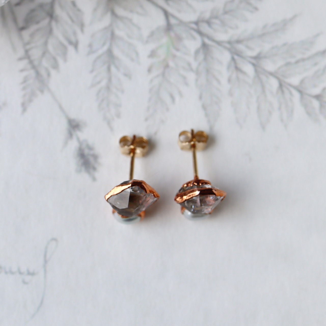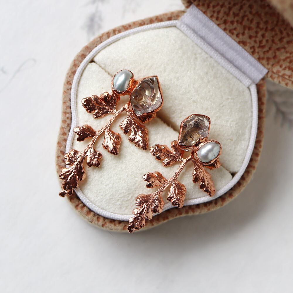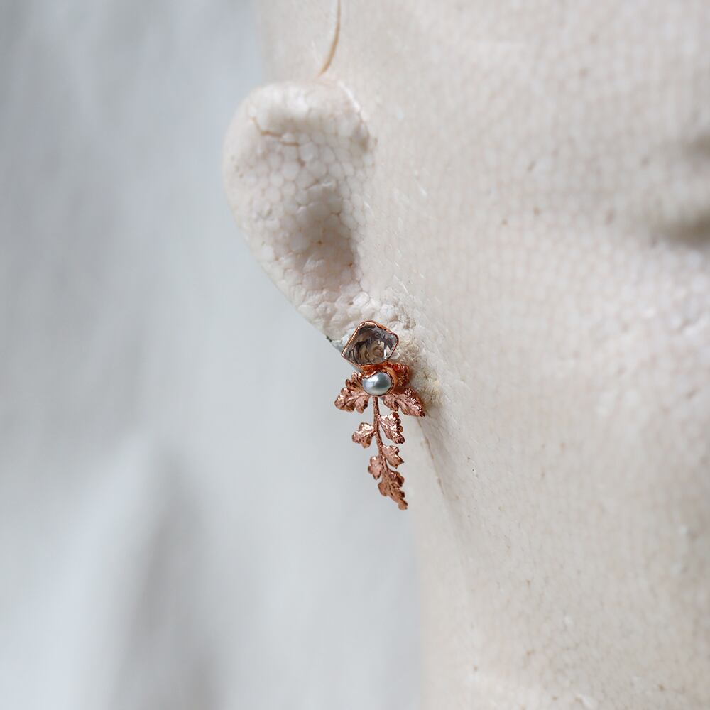 両端が尖った結晶そのままの形、強い輝きと透明感のダイヤモンドクォーツと、自然な丸み、上品な艶が美しい小粒パール。天然石のピアストップから葉っぱが生い茂るようなピアスです。