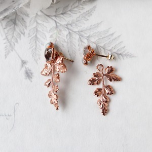 トップだけでシンプルに、葉っぱパーツを合わせると華やかに、2wayでお使いいただけます。天然石のラフな輝きと植物の造形を組み合わせ、自然そのままの美しさで耳元を飾るアイテムです。