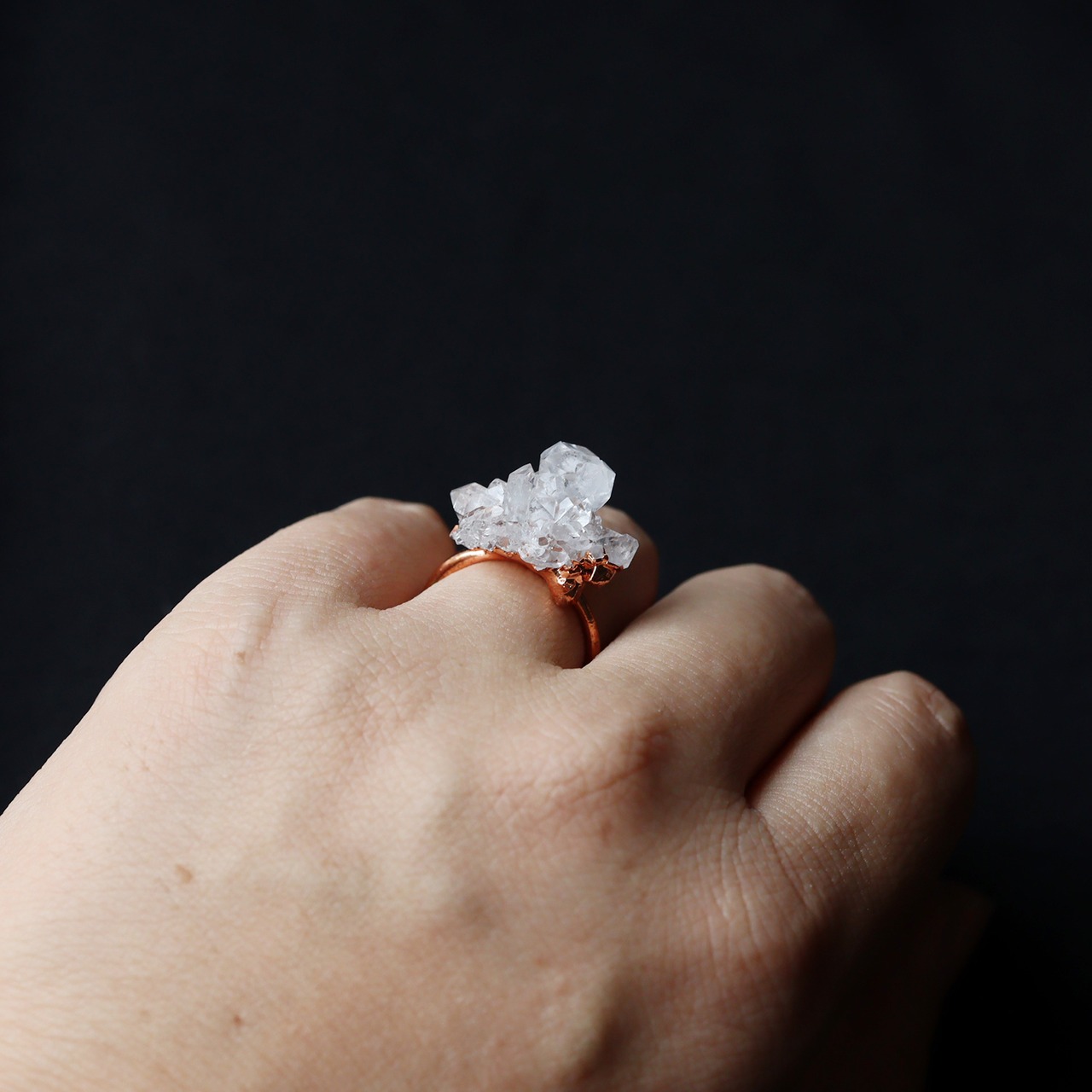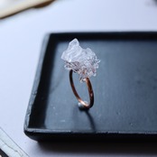 原石そのままの形を活かして一部金属でコーティングし、個性的なリングにしました。チェーンに通せばネックレスとしてもかわいいです。