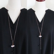 全長90cmのロングチェーンは、細めで雰囲気のあるデザイン。お好きな場所で金具を留められるので、1連・2連の他、エンドをY字に組み合わせたり背中に垂らしたり、使い方も色々楽しめます。