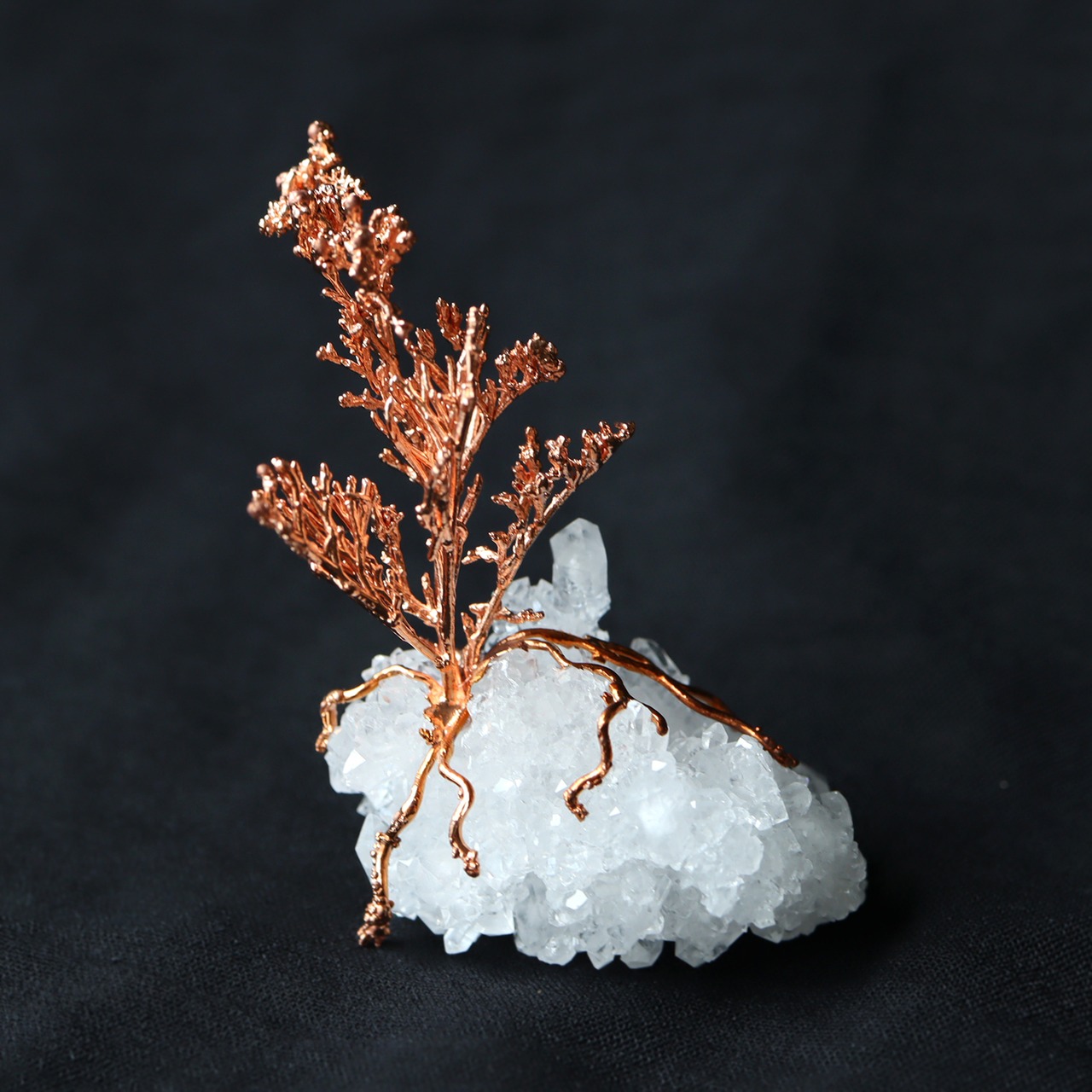 植物や鉱物など、金属ではないものの表面に電気メッキをかける技術。素材をそのまま金属に変える、錬金術のような技法です。自然と科学が組み合わさってできあがるものには、唯一無二の存在感と美しさがあります。