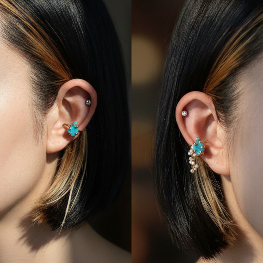 耳にフィットするサイズ感で、軽やかな着け心地。ピアスが開いている人も開いていない人も、今っぽくおしゃれに合わせられます。ターコイズは12月の誕生石。プレゼントにもおすすめです。
