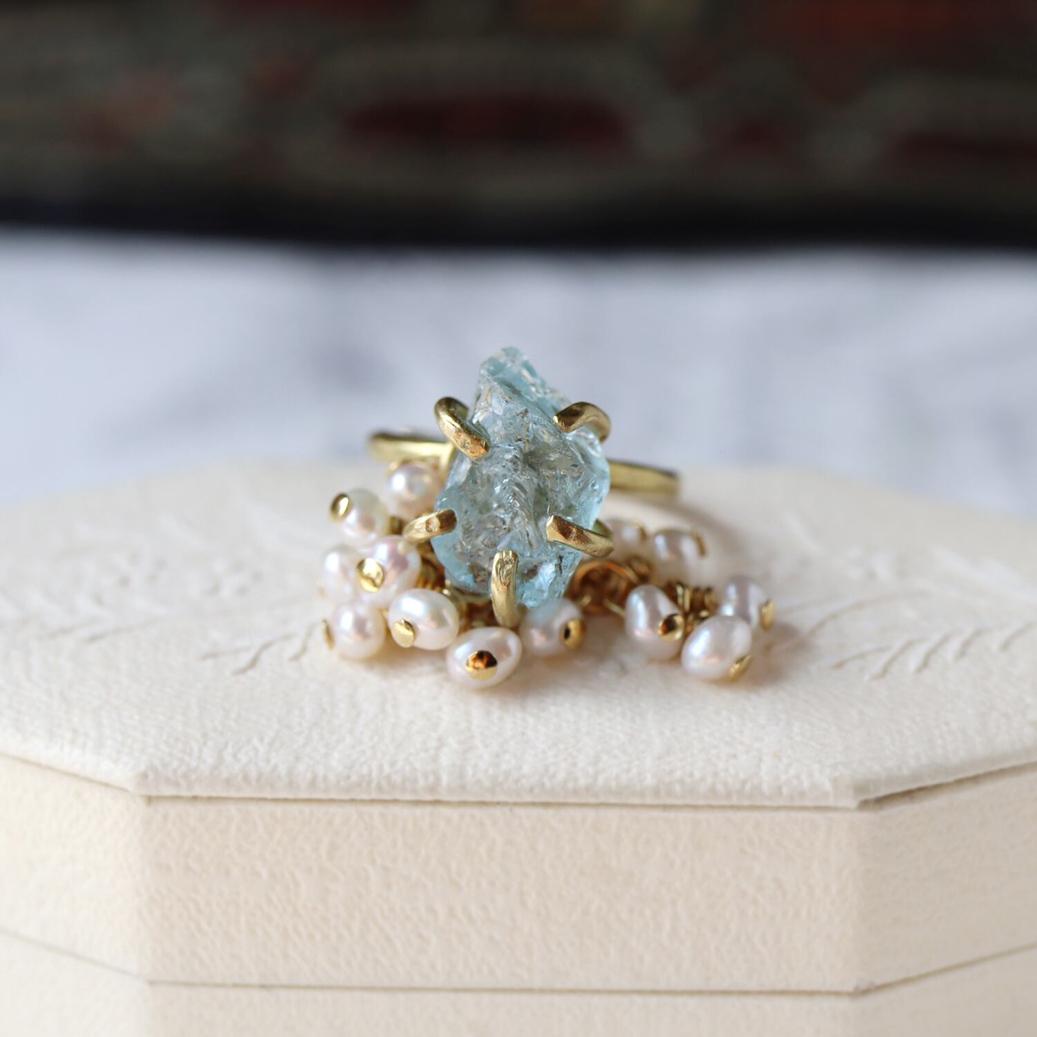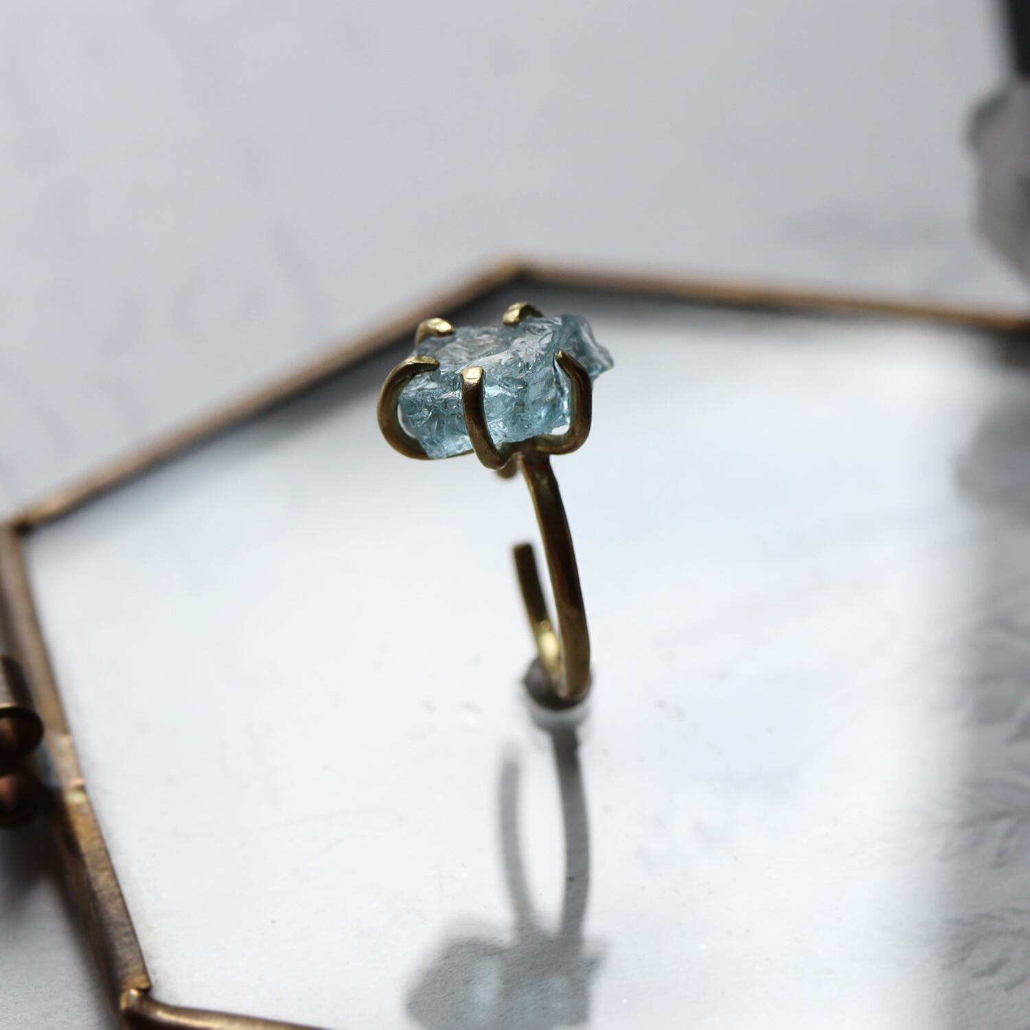 凛とした水色、石の内部で光がきらきらと揺れるような透明感が美しいトパーズ。ころんと存在感のある大きさをそのままに、真鍮の爪でシンプルに留め、ベビーリングのようなイヤーカフにしました。