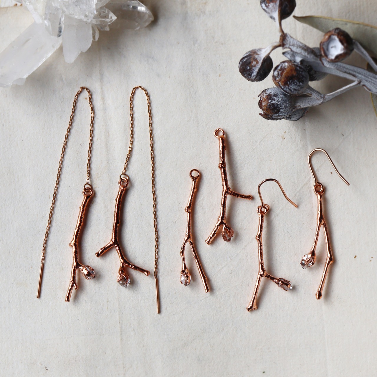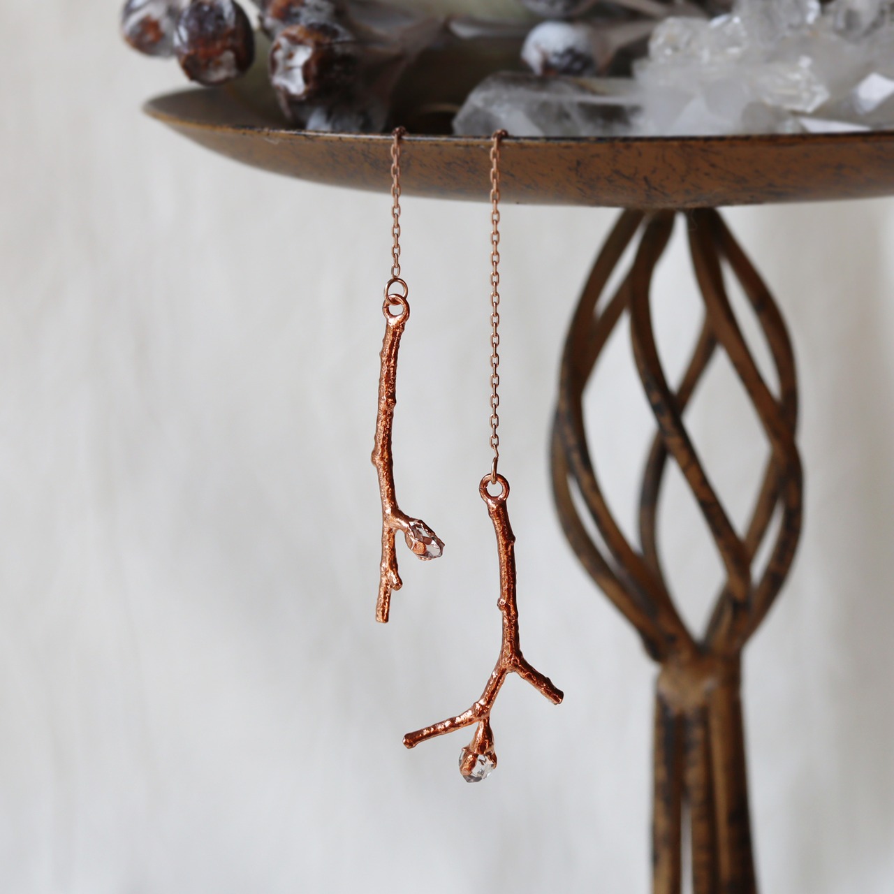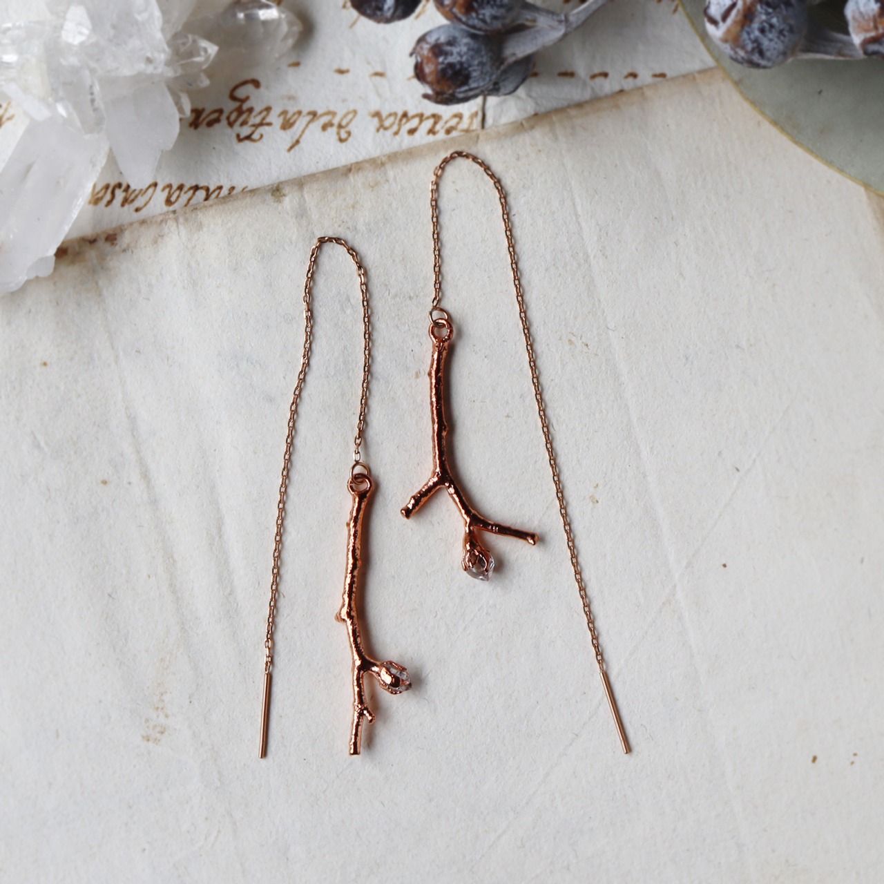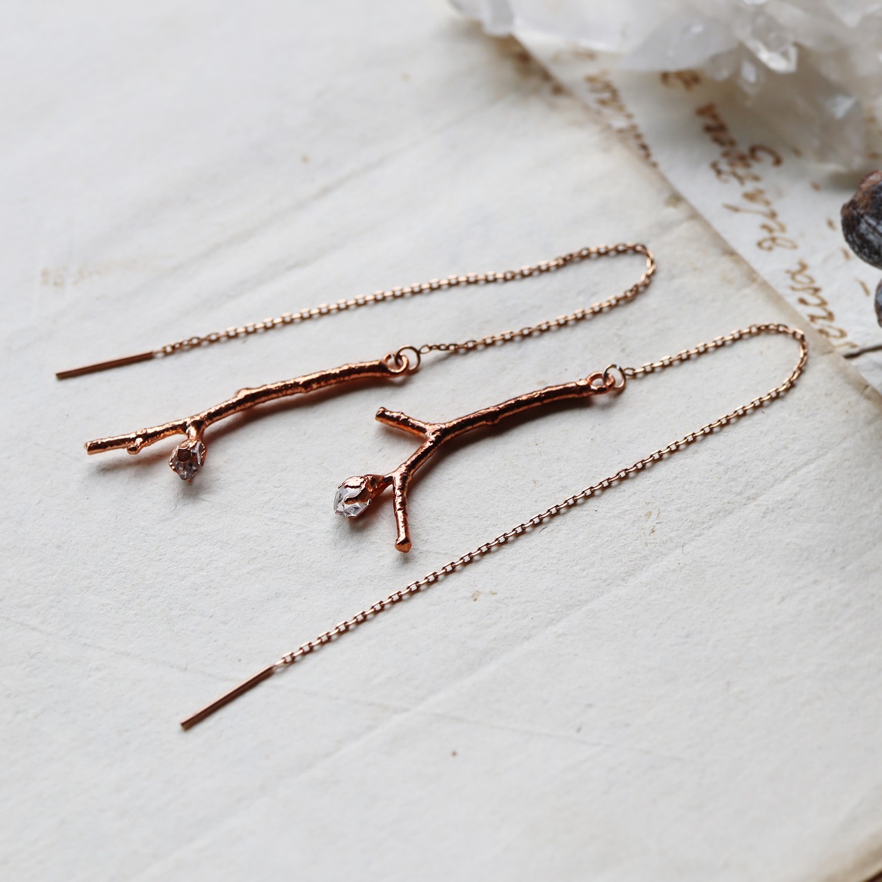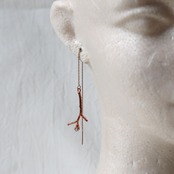 細い小枝の先に小さなダイヤモンドクォーツの原石が実ったシンプルなピアス。