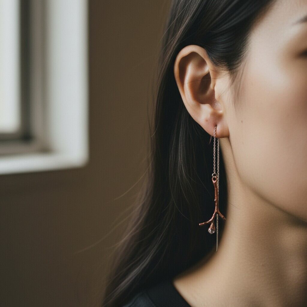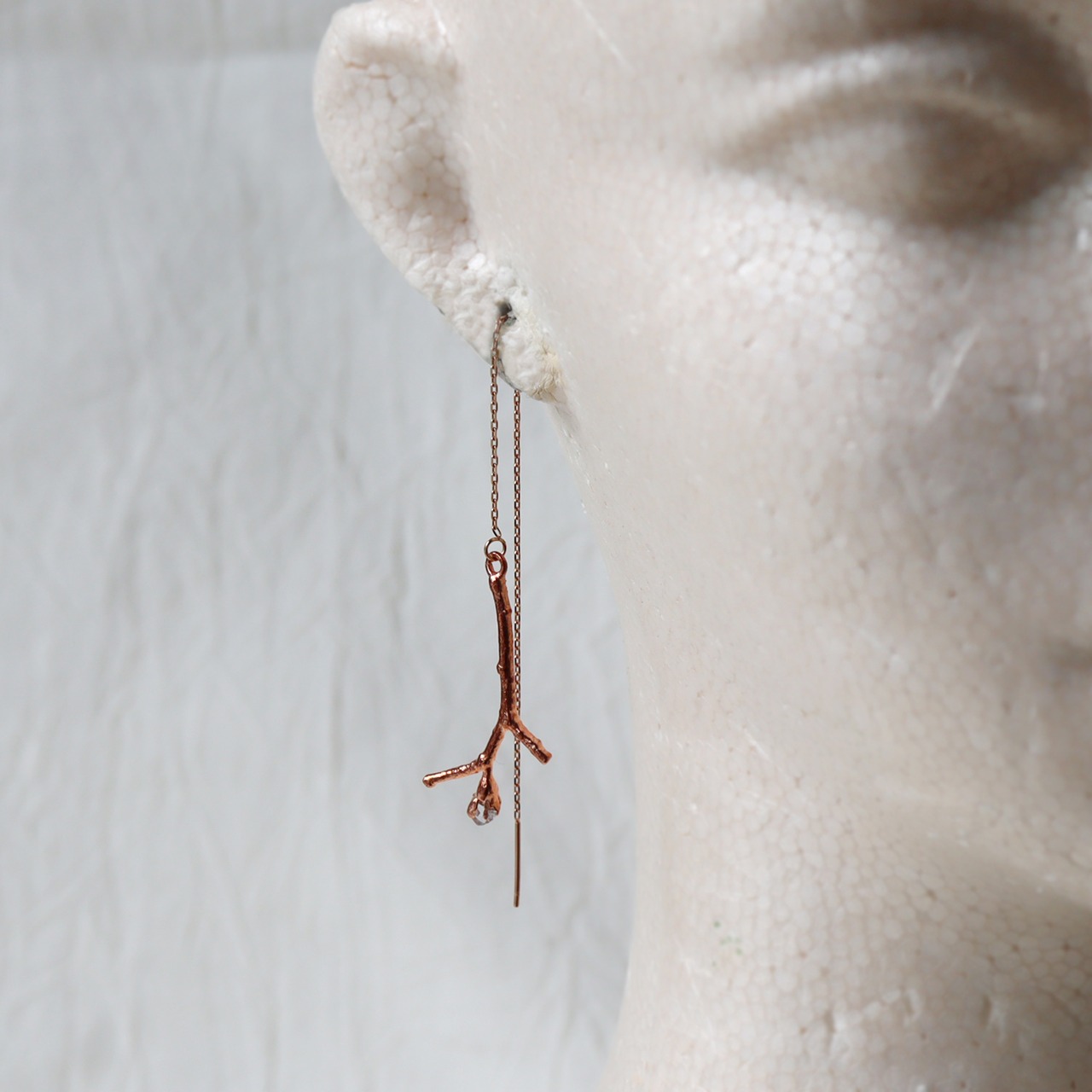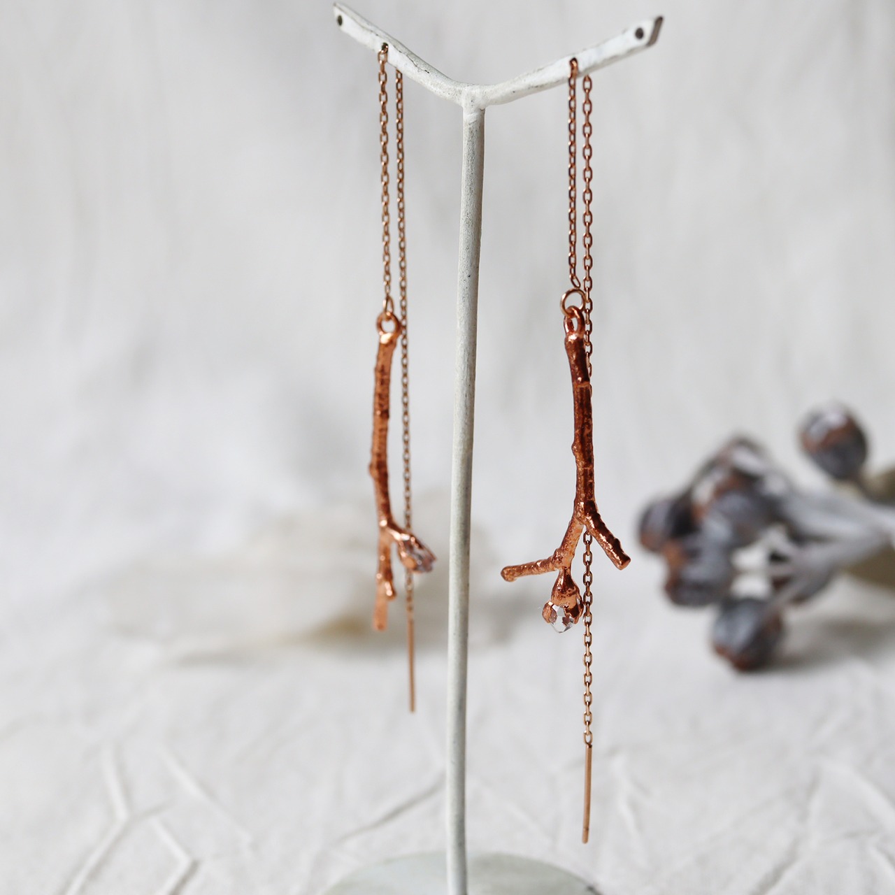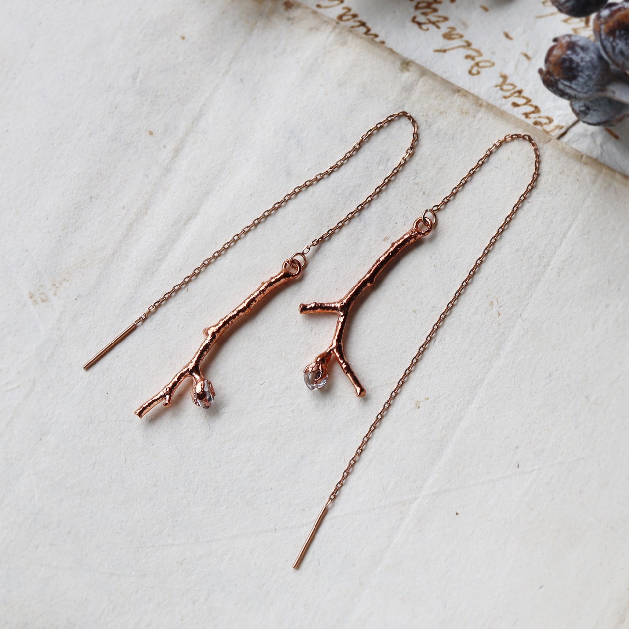 細い小枝の先に小さなダイヤモンドクォーツの原石が実ったシンプルなピアス。